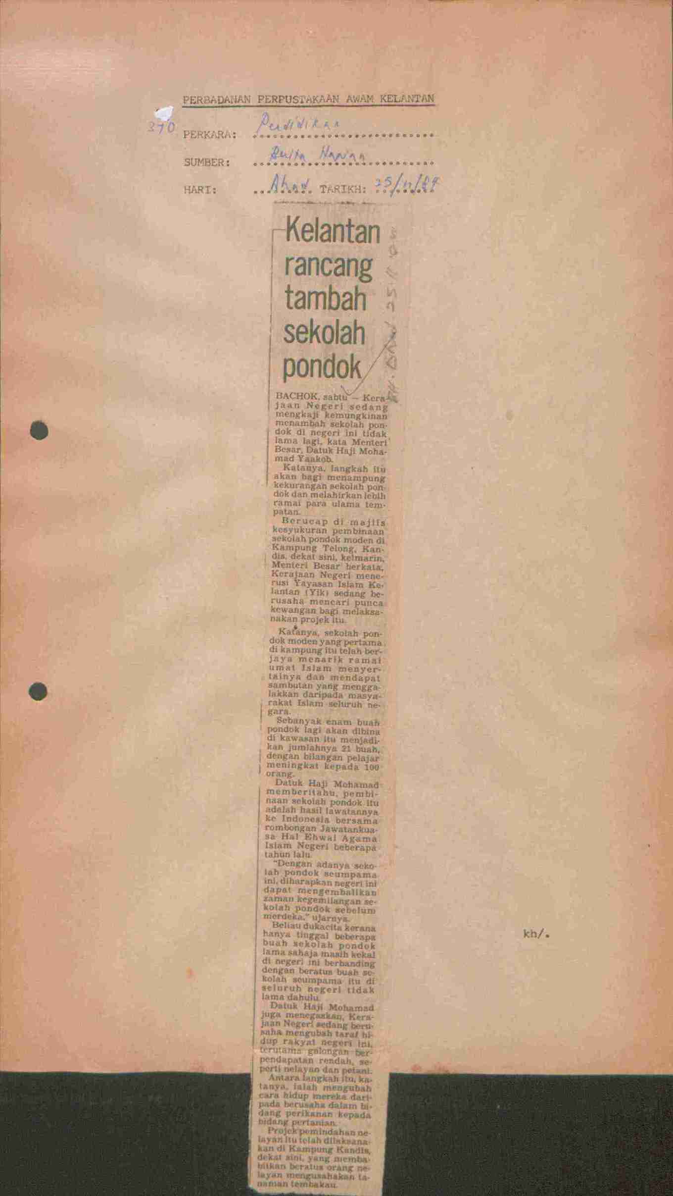 Berita Harian (1984) Kelantan rancang tambah sekolah pondok. Berita Harian. |