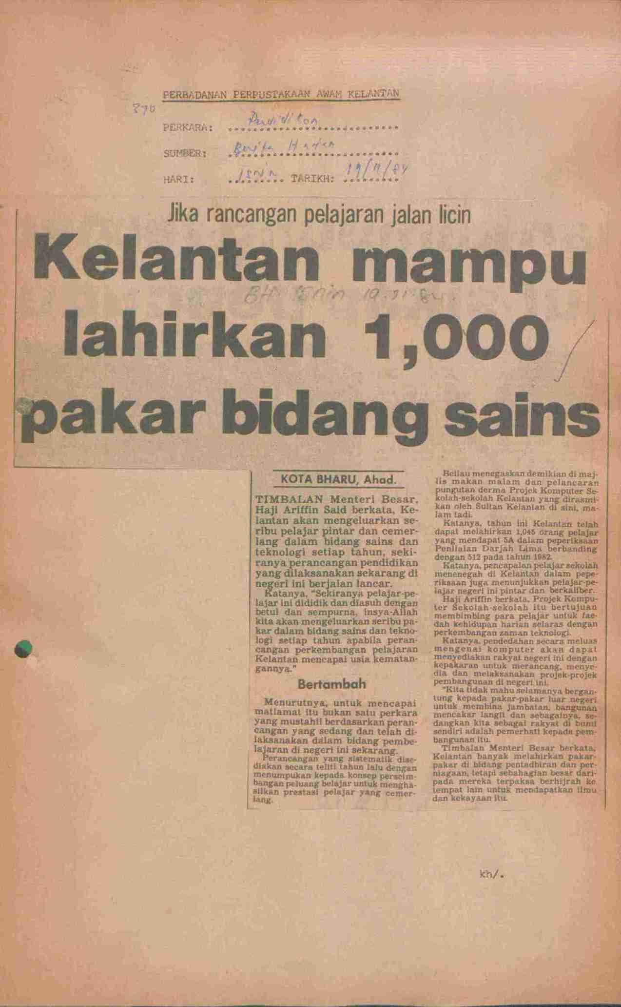 Berita Harian (1984) Kelantan mampu lahirkan 1,000 pakar bidang sains. Berita Harian. |