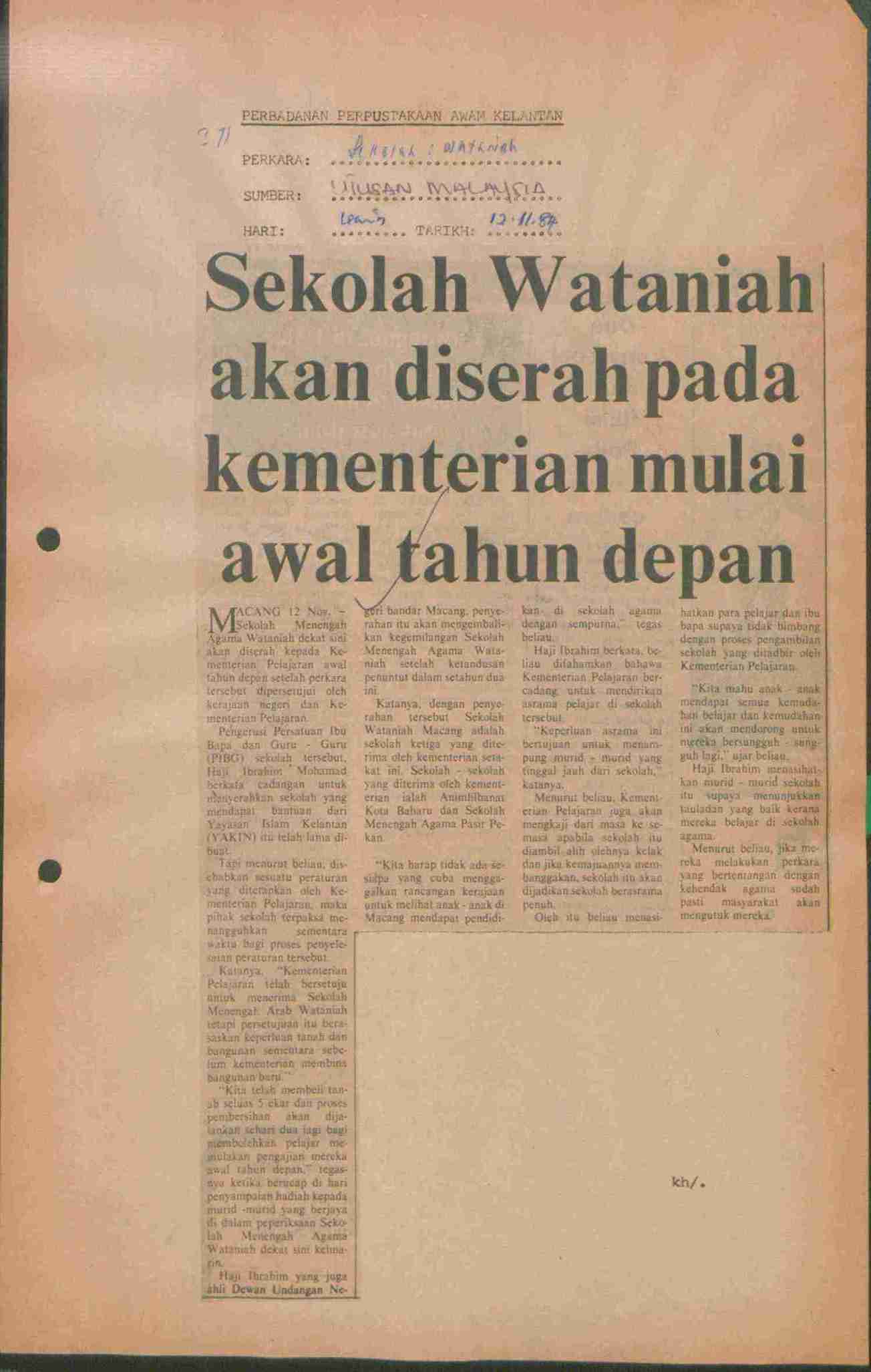 Utusan Malaysia (1984) Sekolah Wataniah akan diserah pada kementetian mulai awal tahun depan. Utusan Malaysia. |