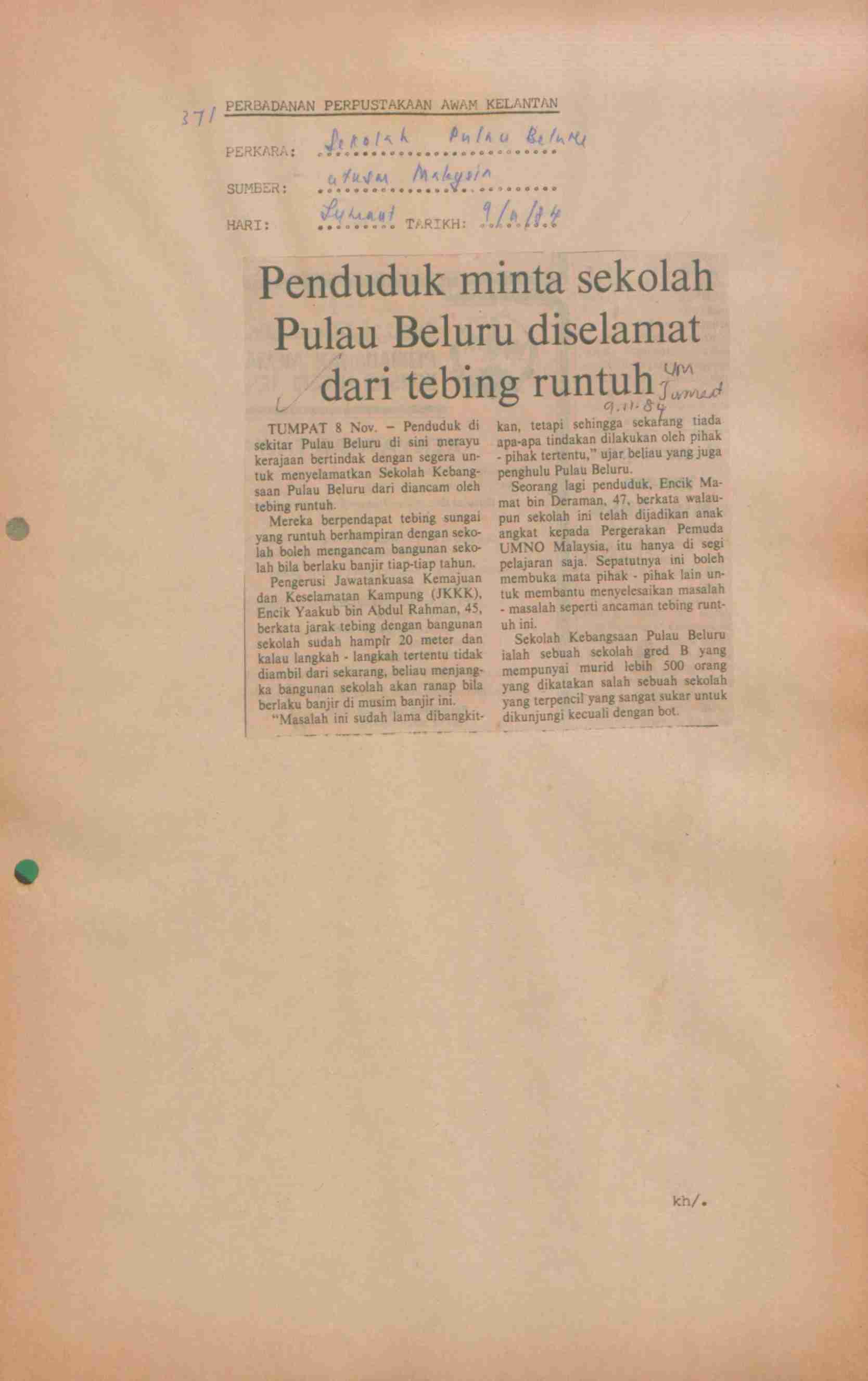 Utusan Malaysia (1984) Penduduk minta sekolah Pulau Beluru diselamat dari tebing runtuh. Utusan Malaysia. |