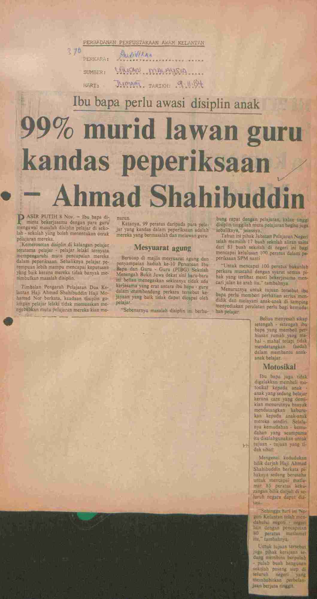 Utusan Malaysia (1984) 99% murid lawan guru kandas peperiksaan - Ahmad Shahibuddin. Utusan Malaysia. |