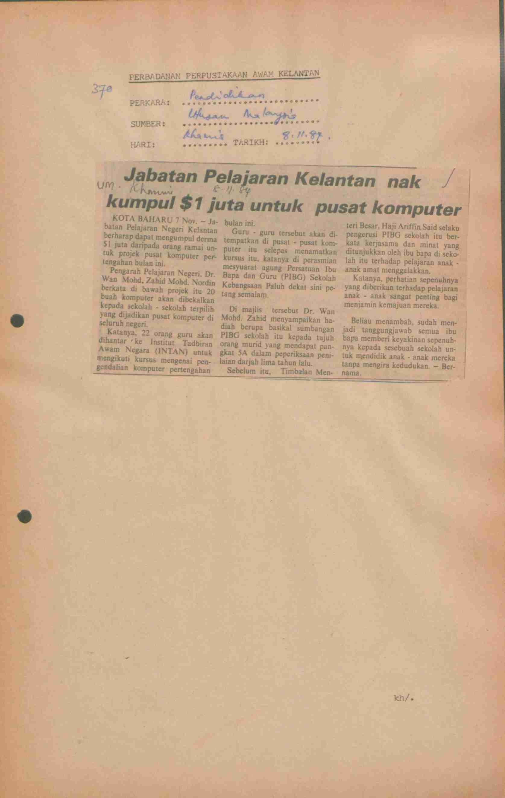 Utusan Malaysia (1984) Jabatan pelajaran Kelantan nak kumpul $1 juta untuk pusat komputer. Utusan Malaysia. |