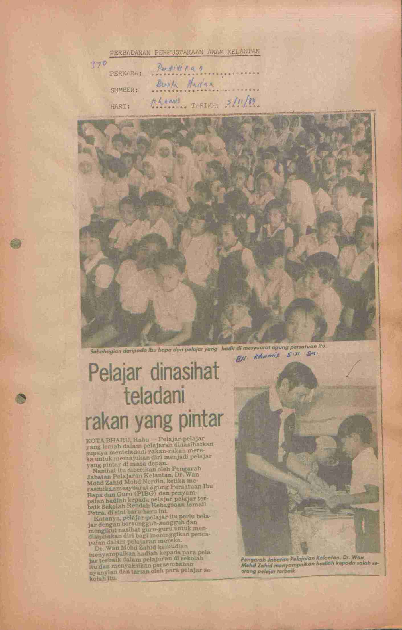 Berita Harian (1984) Pelajar dinasihat teladani rakan yang pintar. Berita Harian. |