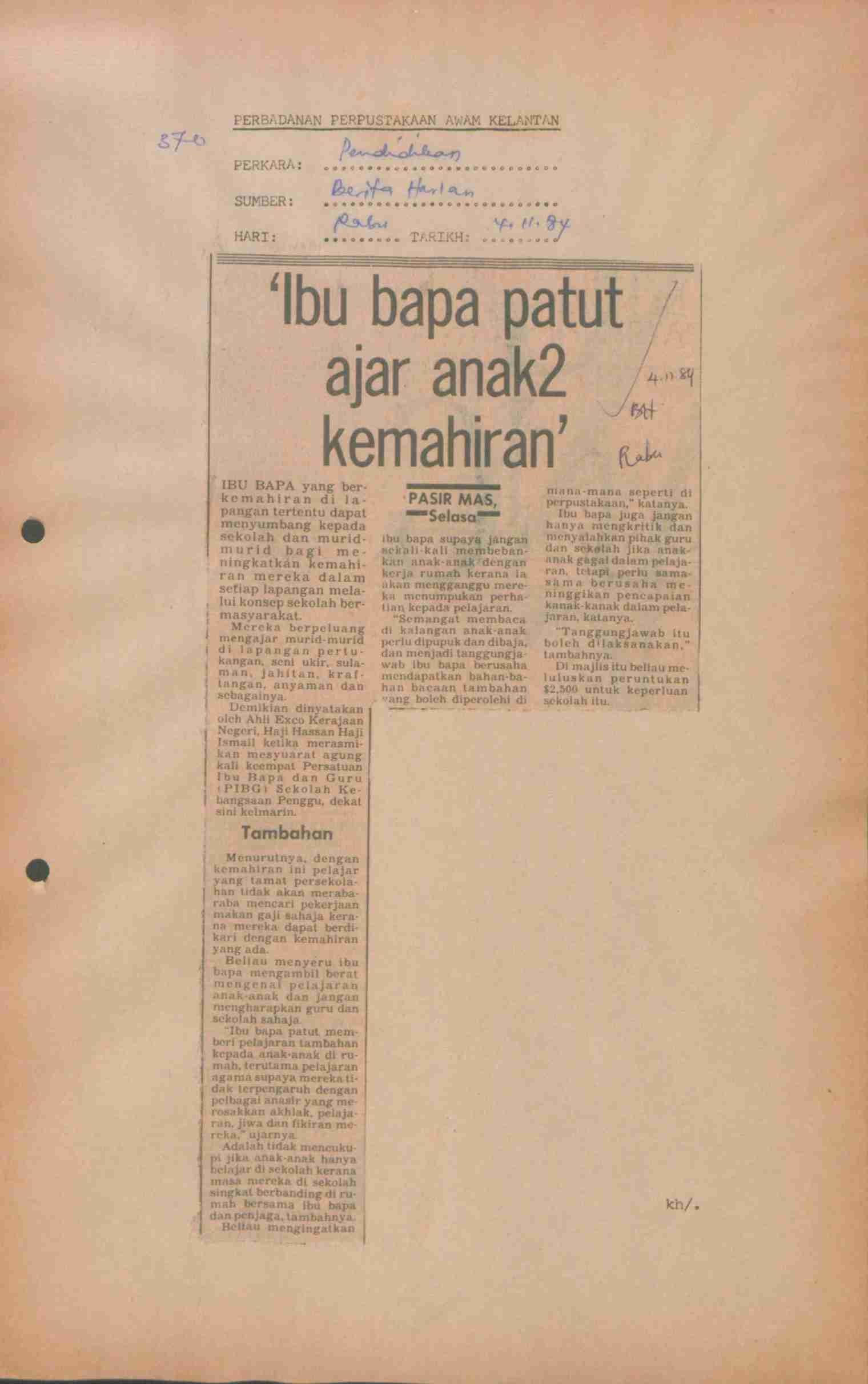 Berita Harian (1984) 'Ibu bapa patut ajar anak2 kemahiran'. Berita Harian. |