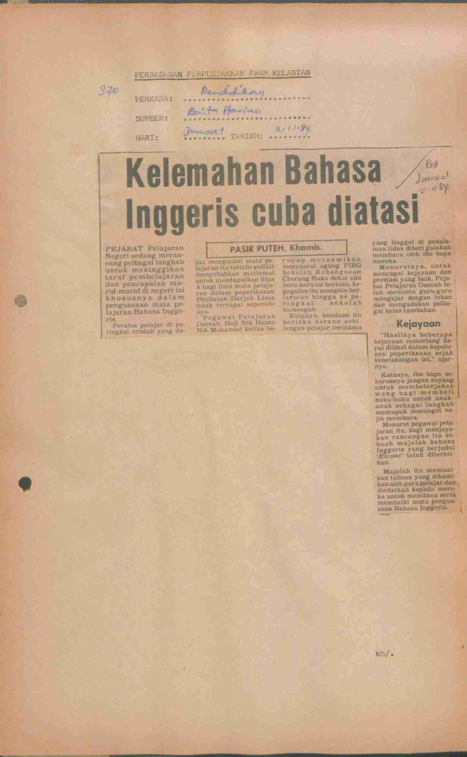 Berita Harian (1984) Kelemahan Bahasa Inggeris cuba diatasi. Berita Harian. |