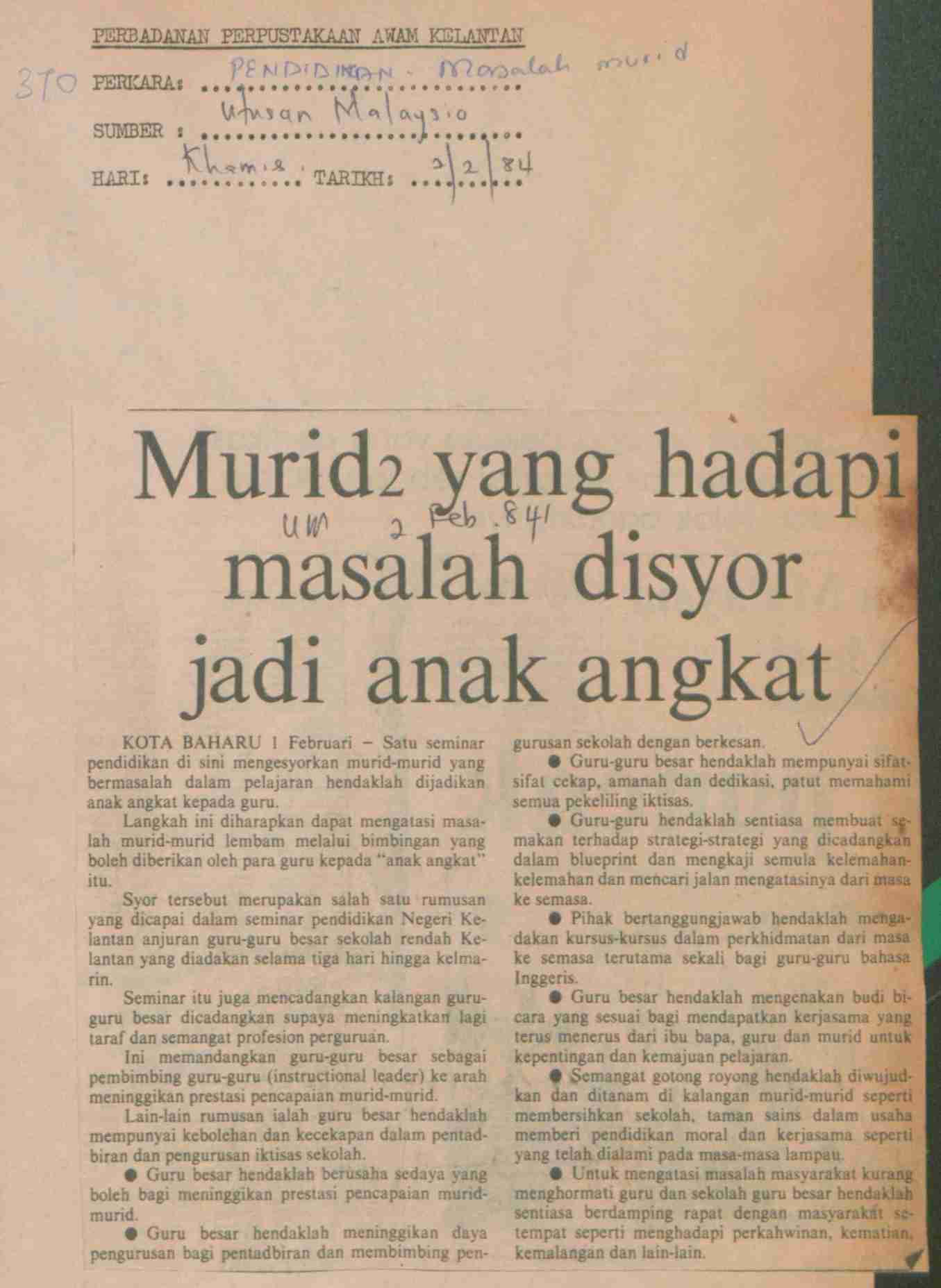 Utusan Malaysia (1984) Murid 2 yang hadapi masalah disyor jadi anak angkat. Utusan Malaysia. |