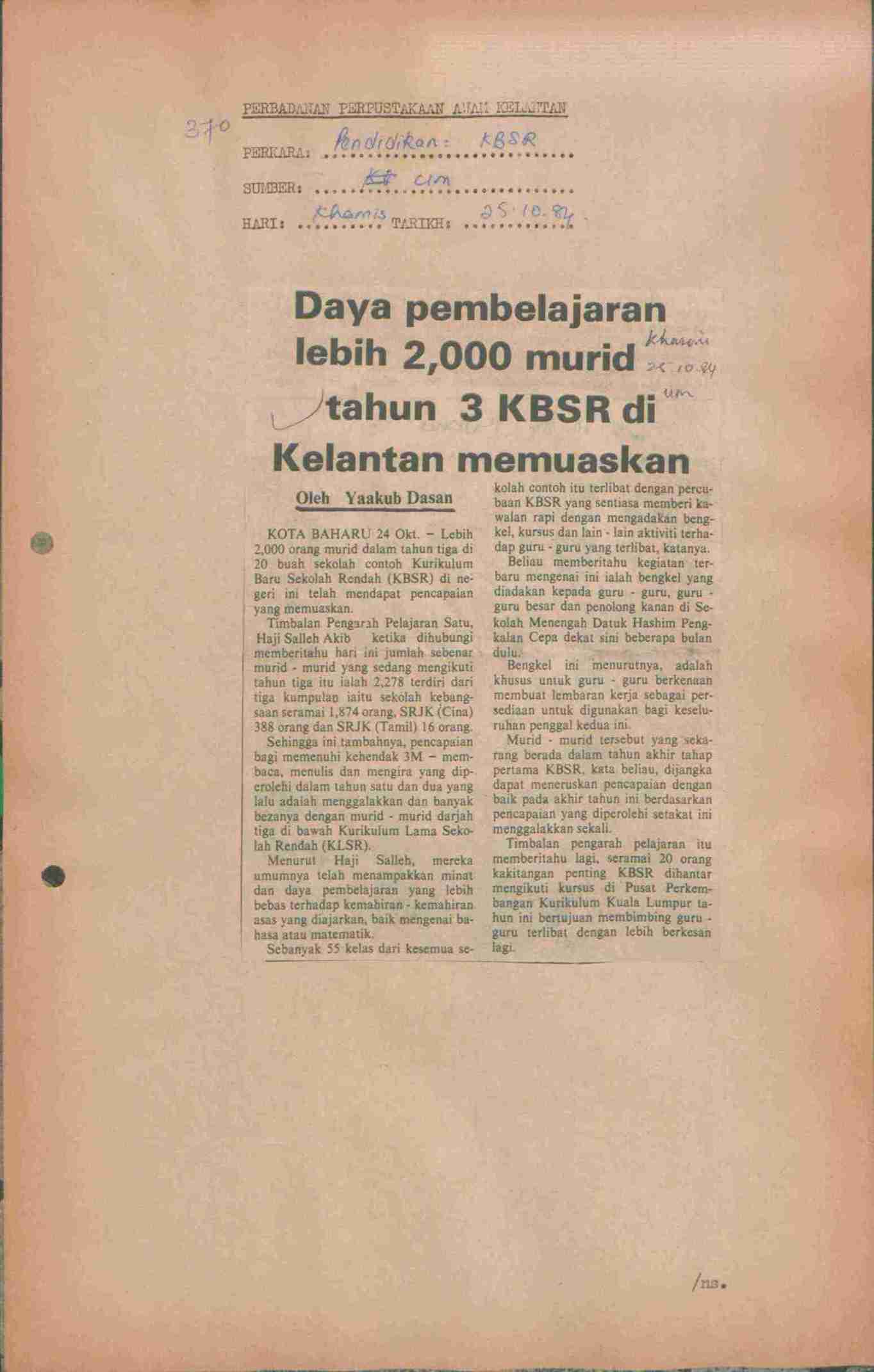 Utusan Malaysia (1984) Daya pembelajaran lebih 2,000 murid tahun 3 KBSR di Kelantan memuaskan. Utusan Malaysia. |