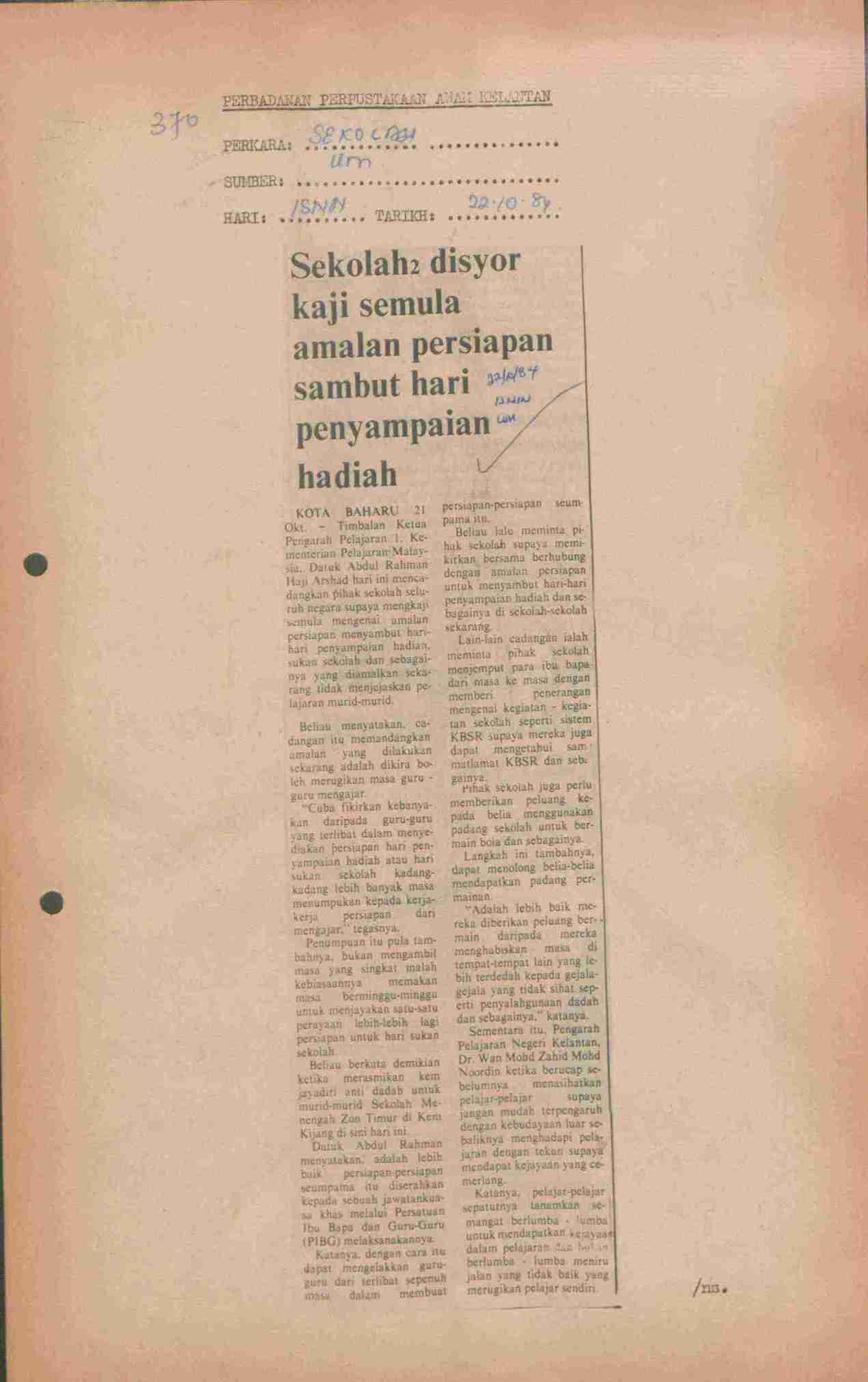 Utusan Malaysia (1984) Sekolah2 disyor kaji semula amalan persiapan sambut hari penyampaian hadiah. Utusan Malaysia. |