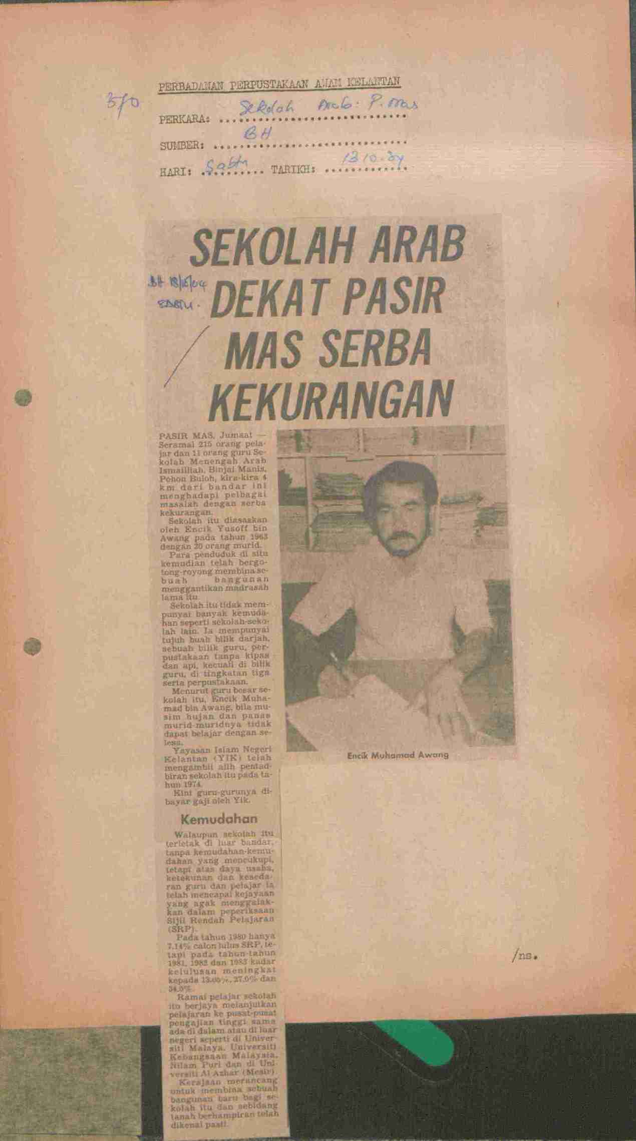 Berita Harian (1984) Sekolah Arab Dekat Pasir Mas Serba Kekurangan. Berita Harian. |