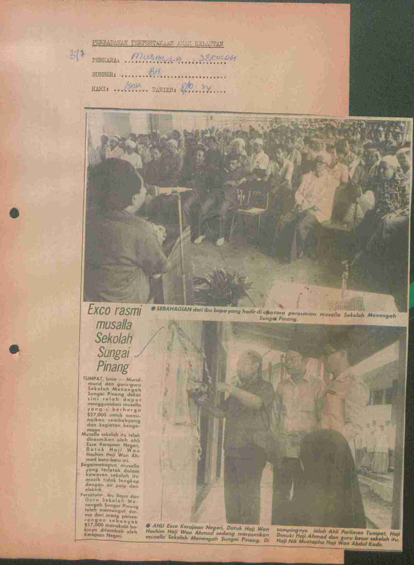 Berita Harian (1984) Exco rasmi musalla Sekolah Sungai Pinang. Berita Harian. |