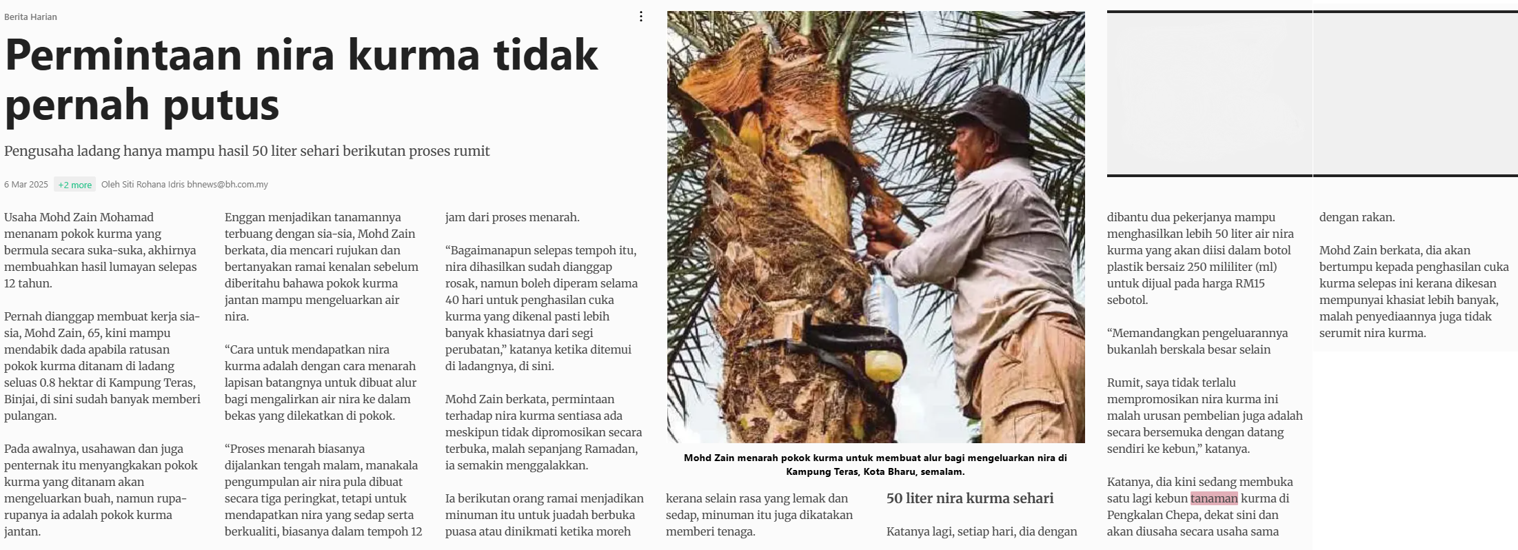 Siti Rohana Idris (2025) Permintaan nira kurma tidak pernah putus. Berita Harian. |