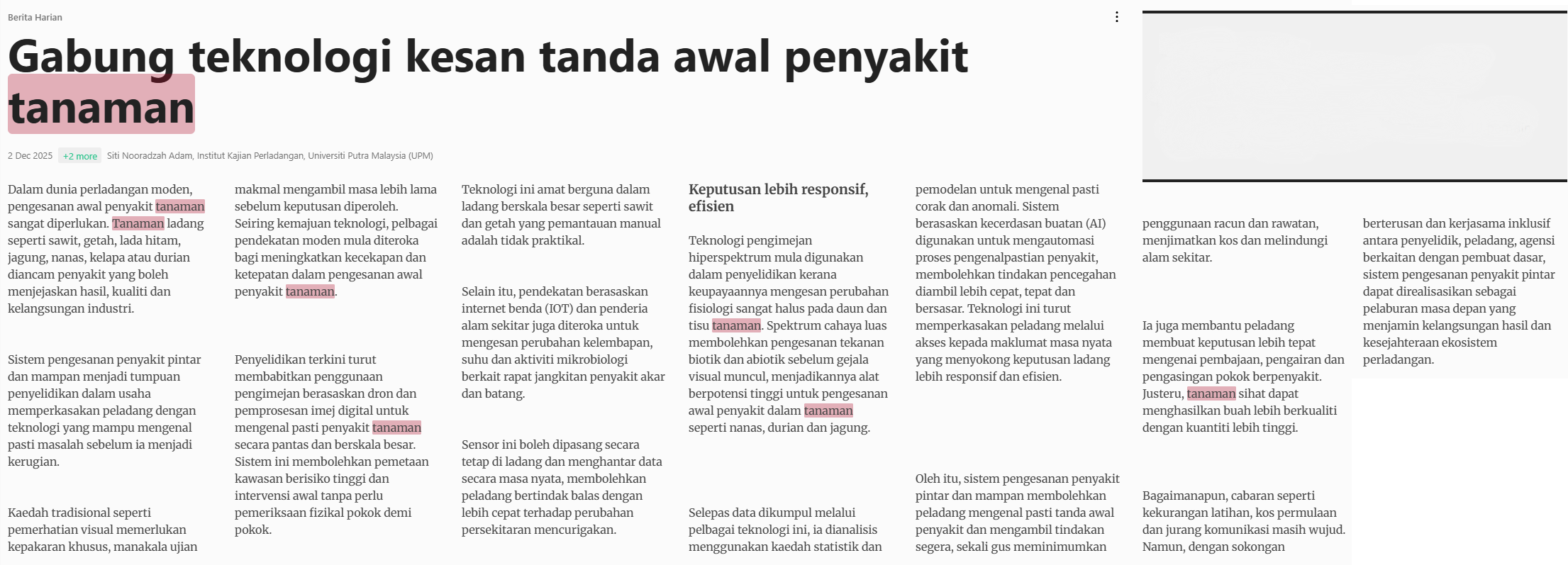 siti Nooradzah Adam (2025) Gabung teknologi kesan tanda awal penyakit tanaman. Berita Harian. |