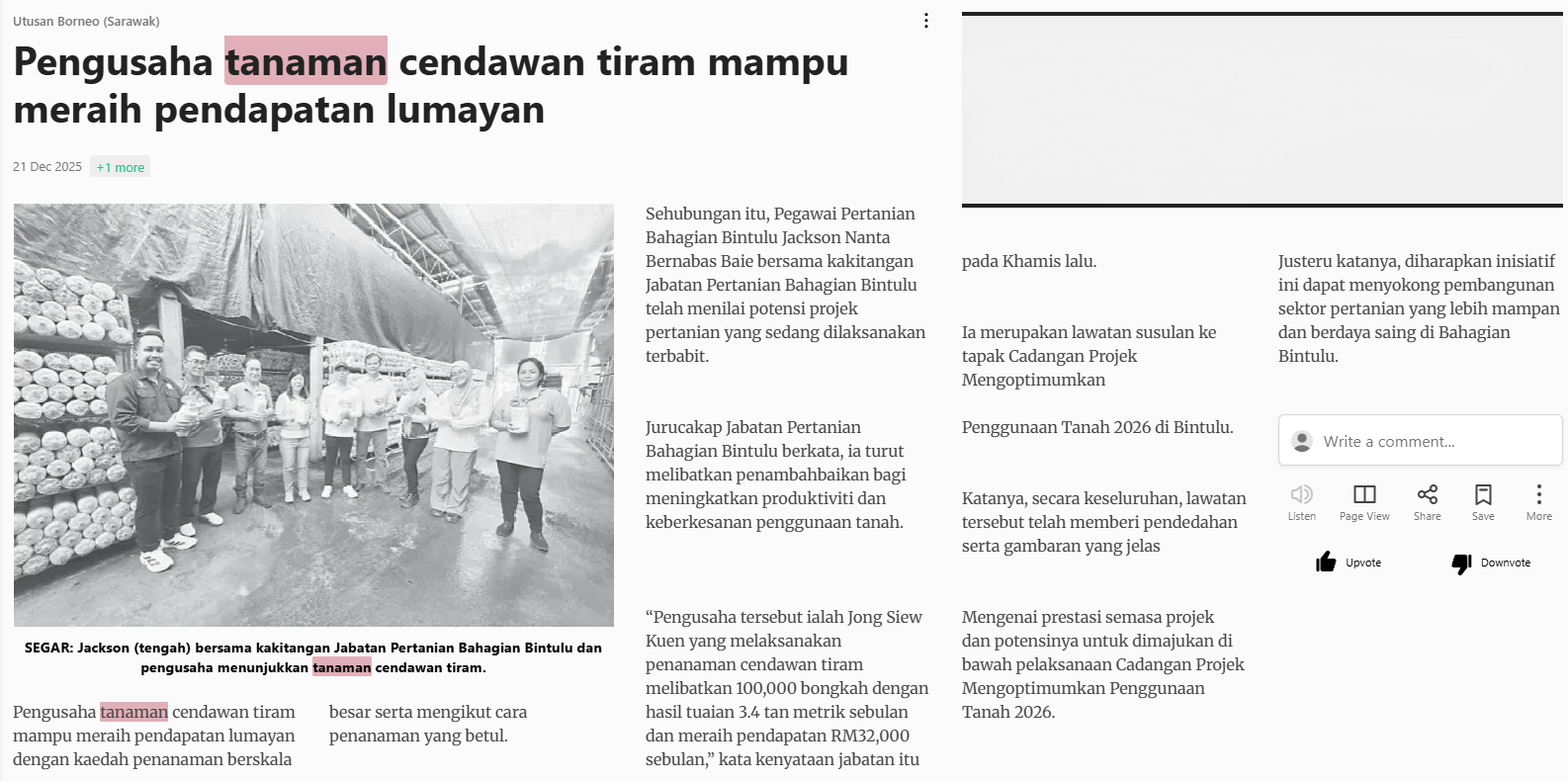 Utusan Borneo (Sarawak) (2025) Pengusaha tanaman cendawan tiram mampu meraih pendapatan lumayan. Utusan Borneo (Sarawak). |