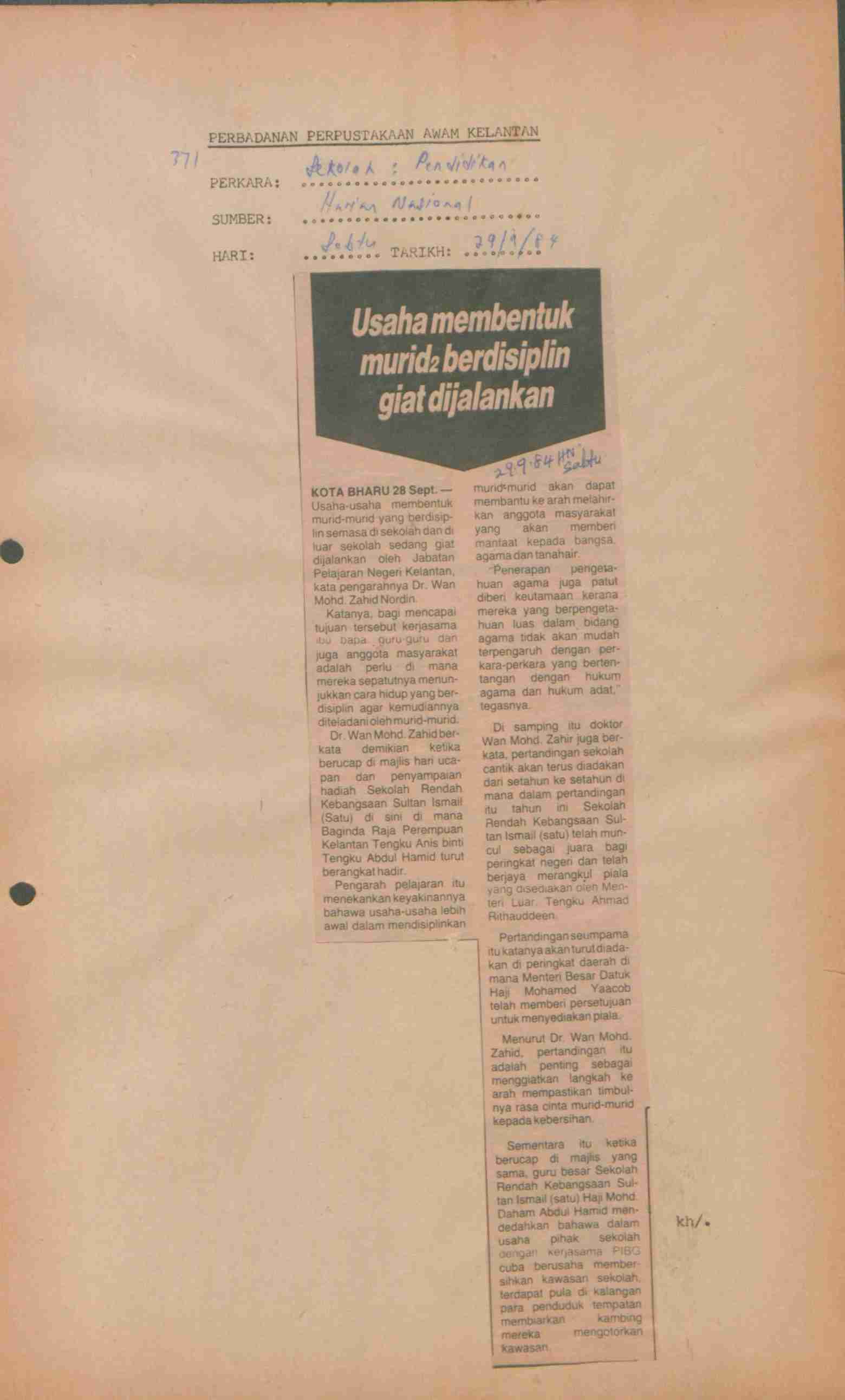 Harian Nasional (1984) Usaha membentuk murid2 berdisiplin giat dijalankan. Harian Nasional. |