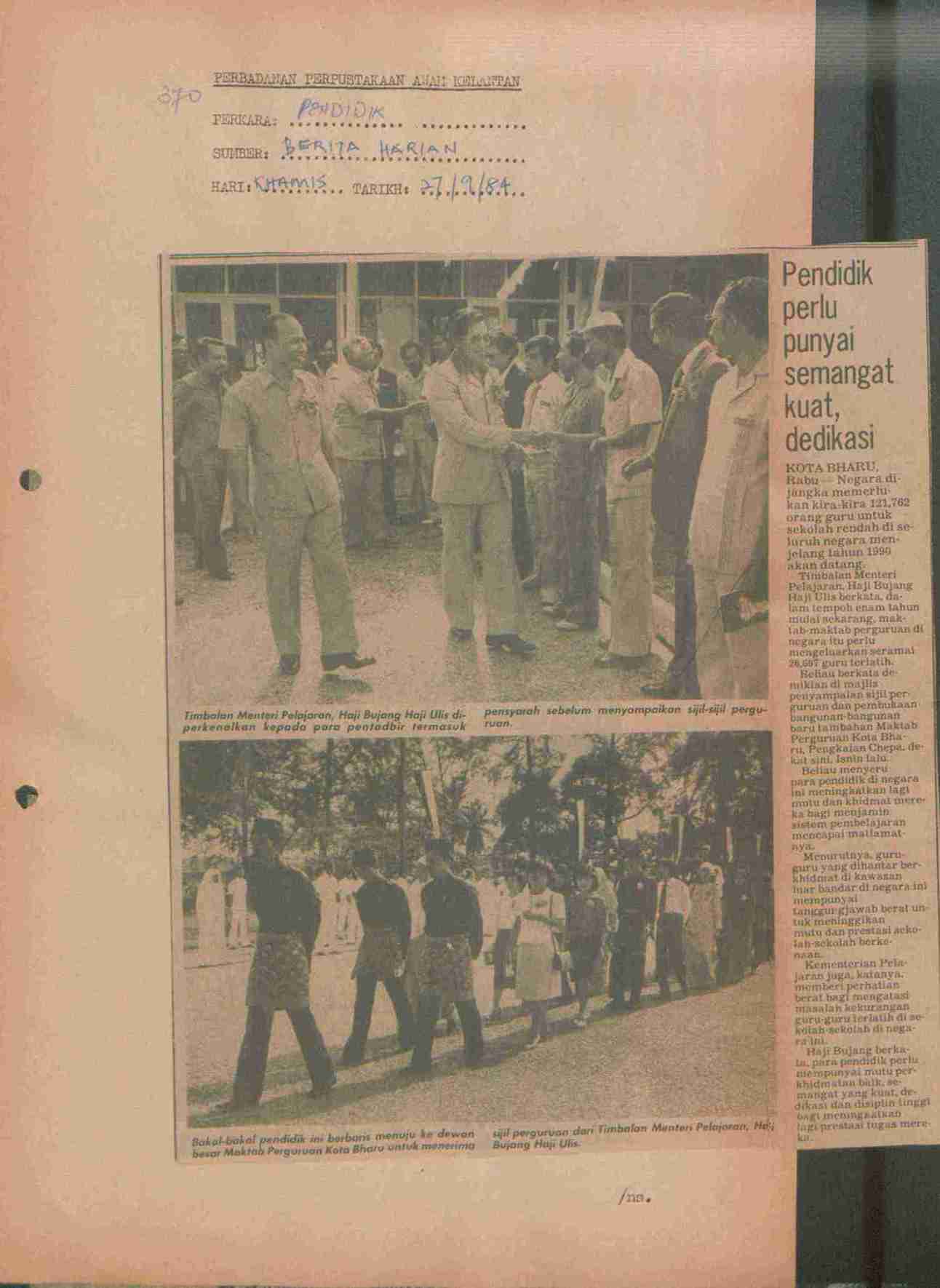 Berita Harian (1984) Pendidik perlu punyai semangat kuat, dedikasi. Berita Harian. |