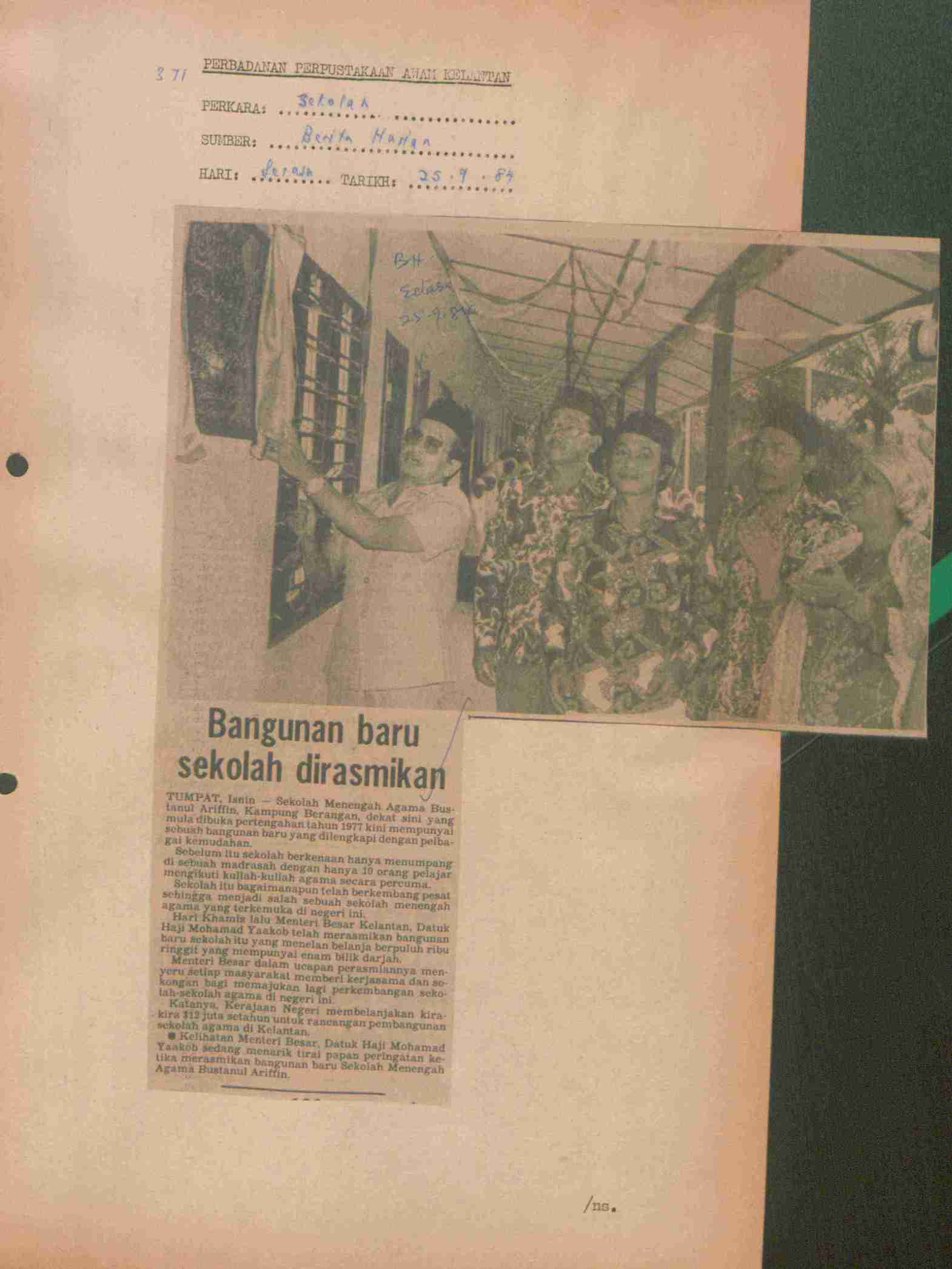 Berita Harian (1984) Bangunan baru sekolah dirasmikan. Berita Harian. |