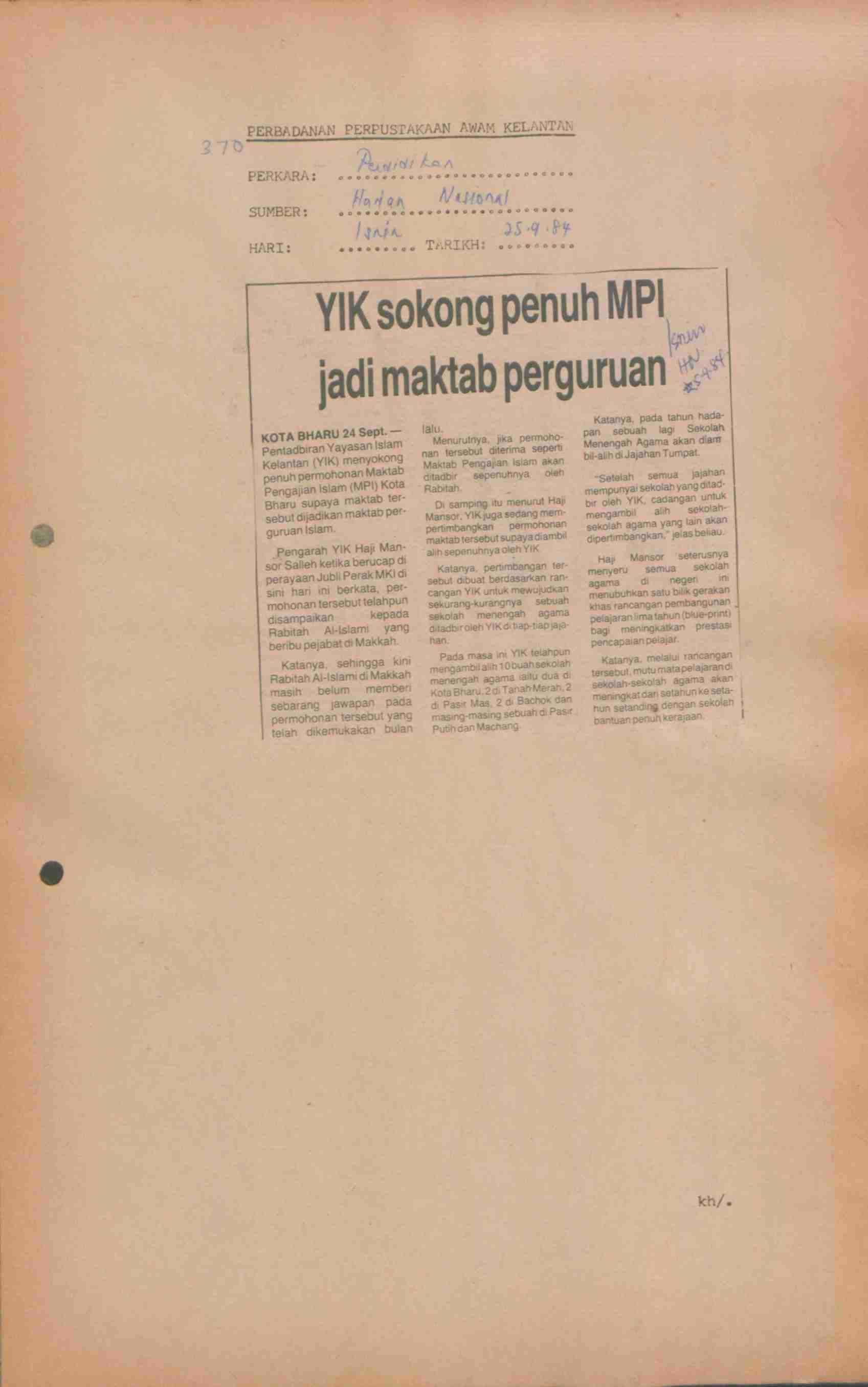 Harian Nasional (1984) YIK sokong penuh MPI jadi maktab perguruan. Harian Nasional. |