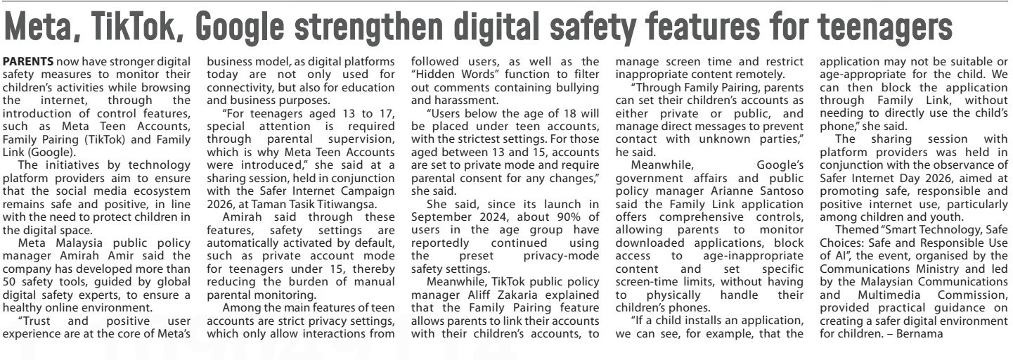 Bernama Meta, TikTok, Google strengthen digital safety features for teenagers. The Sun (Malaysia). |