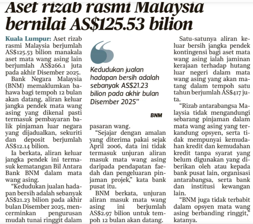 Bernama (2026) Aset rizab rasmi Malaysia bernilai AS$125.53 bilion. Harian Metro. (Submitted) |