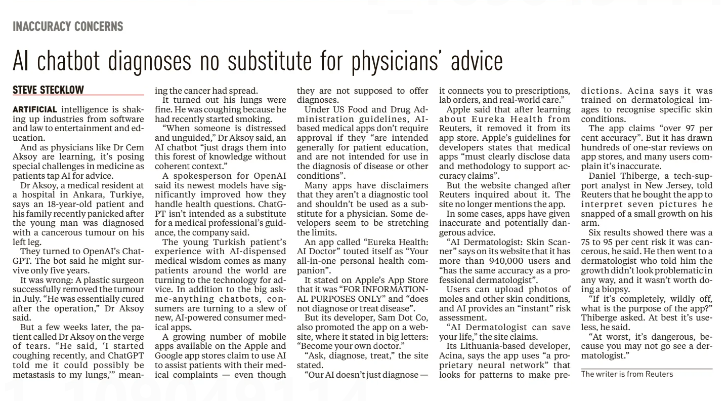 Stecklow, Steve (2026) Ai chatbot diagnoses no substitute for physicians advice. New Straits Times. |