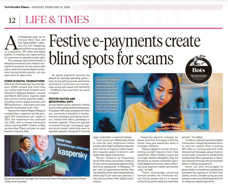 Izwan Ismail (2026) Festive e-payment create blind spots for scams. New Straits Times. |
