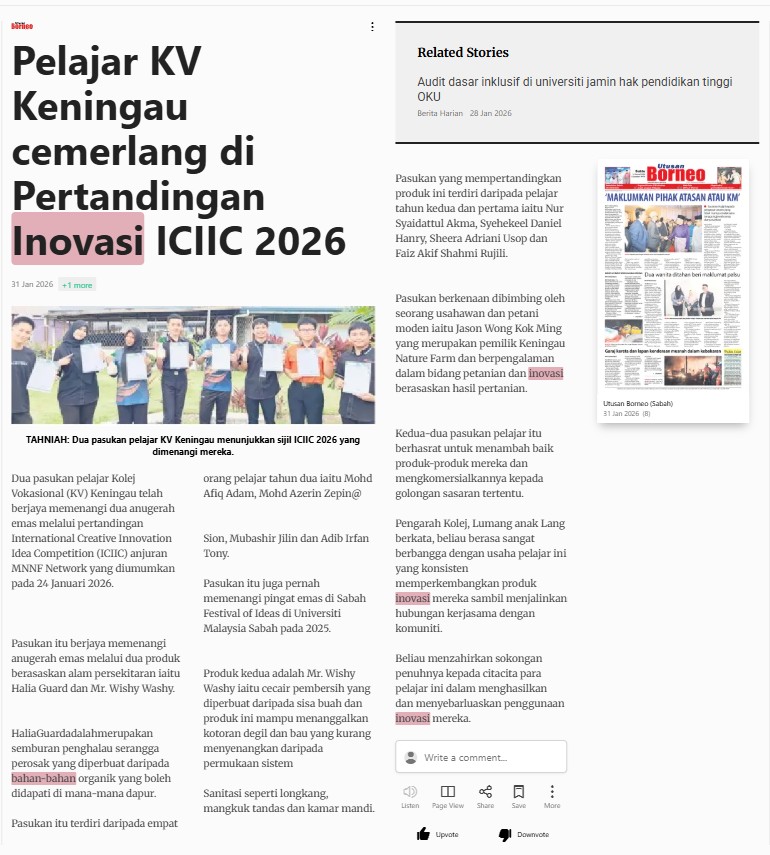 Bernama (2026) Pelajar KV Keningau cemerlang di Pertandingan Inovasi ICIIC 2026. Utusan Borneo (Sabah). |