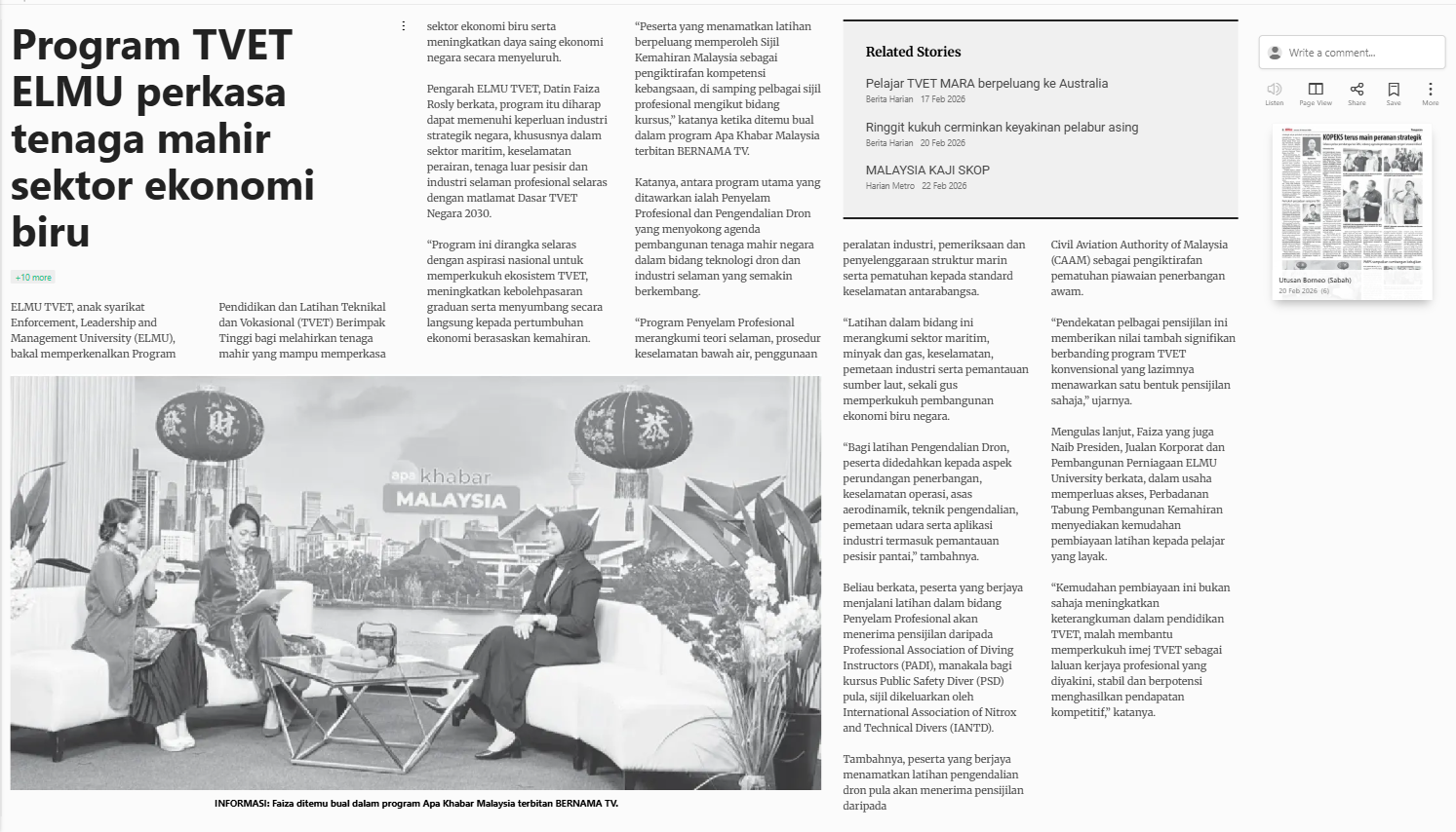 Bernama (2026) Program TVET ELMU perkasa tenaga mahir sektor ekonomi biru. Utusan Borneo. |