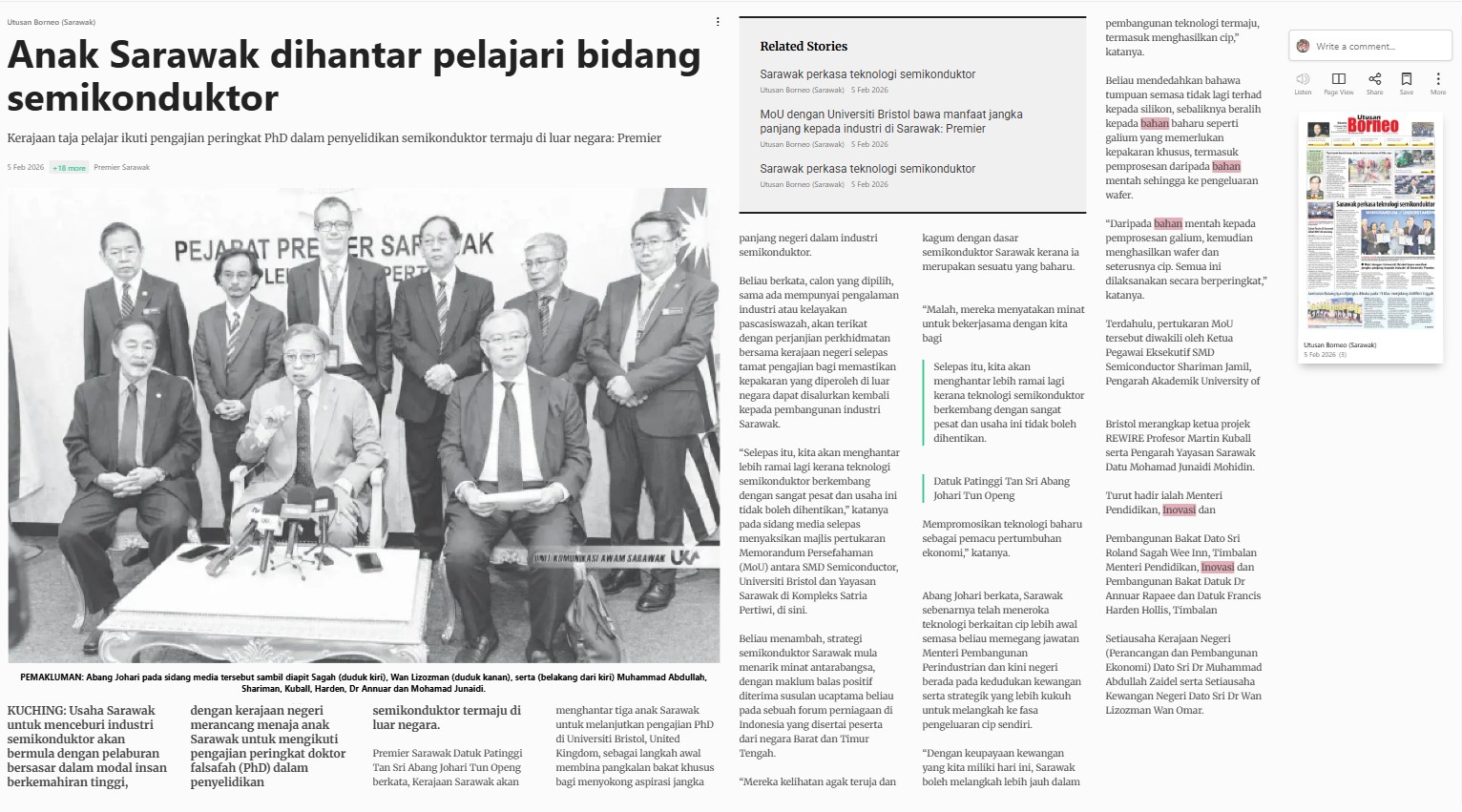 Bernama (2026) Anak Sarawak dihantar pelajari bidang semikonduktor. Utusan Borneo (Sarawak). |