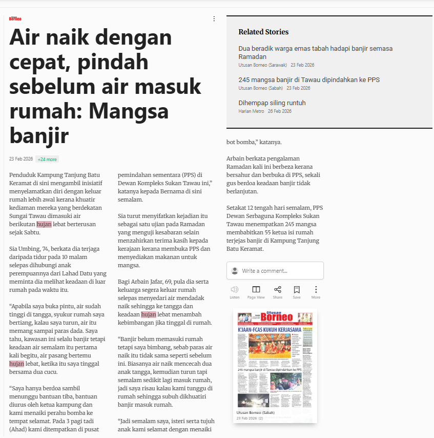 Bernama (2026) Air Naik Dengan Cepat, Pindah Sebelum Air Masuk Rumah: Mangsa Banjir. Berita Harian. |