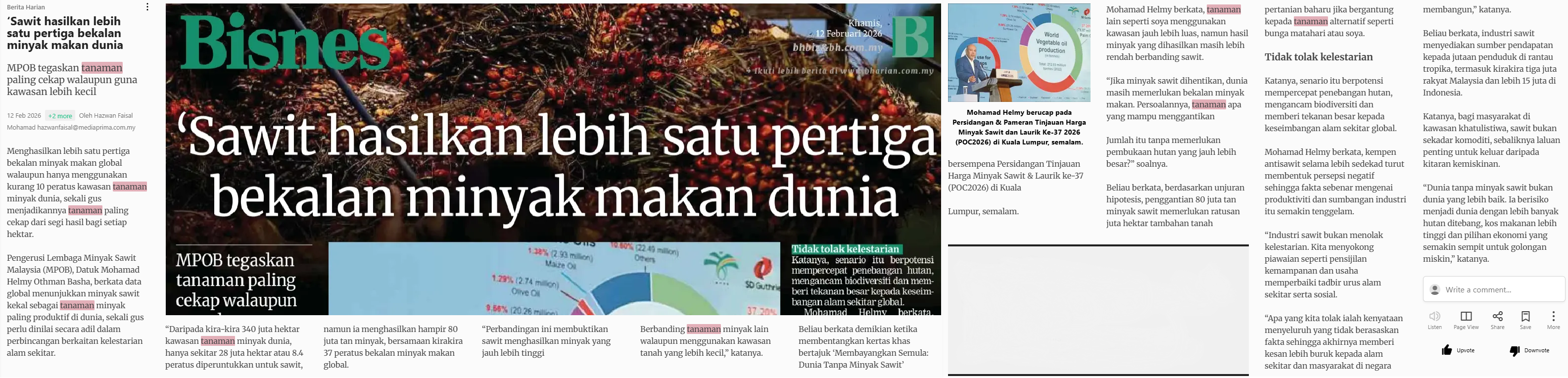 Mohamad hazwan Faisal (2026) 'Sawit hasilkan lebih satu pertiga bekalan minyak dunia. Berita Harian. |