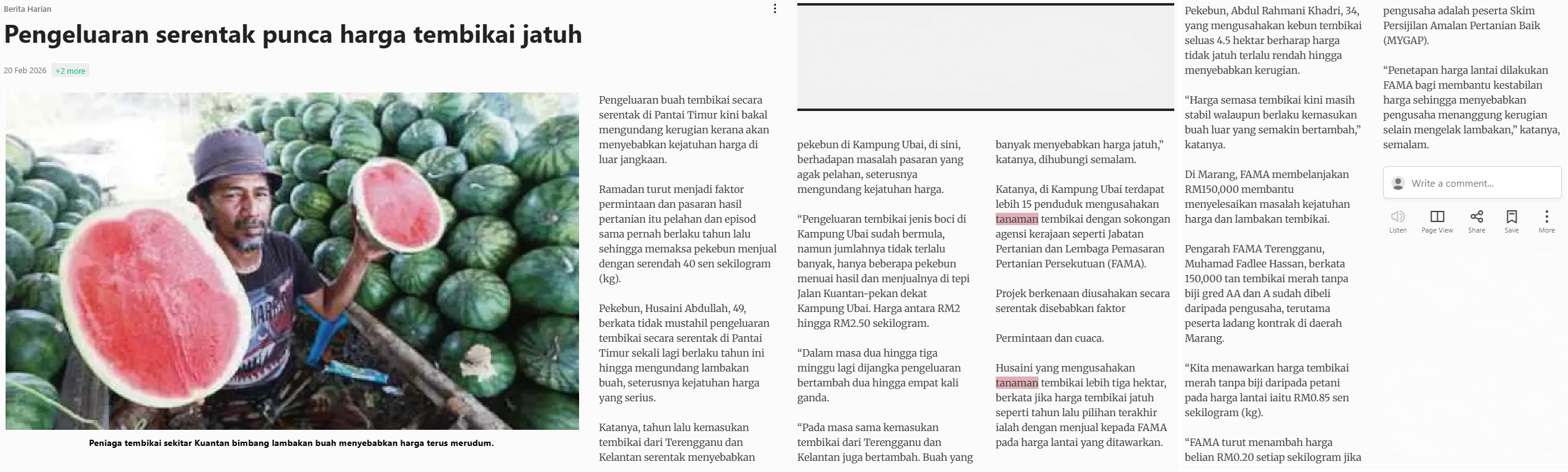 Berita Harian (2026) Pengeluaran serentak punca harga tembikai jatuh. Berita Harian. |