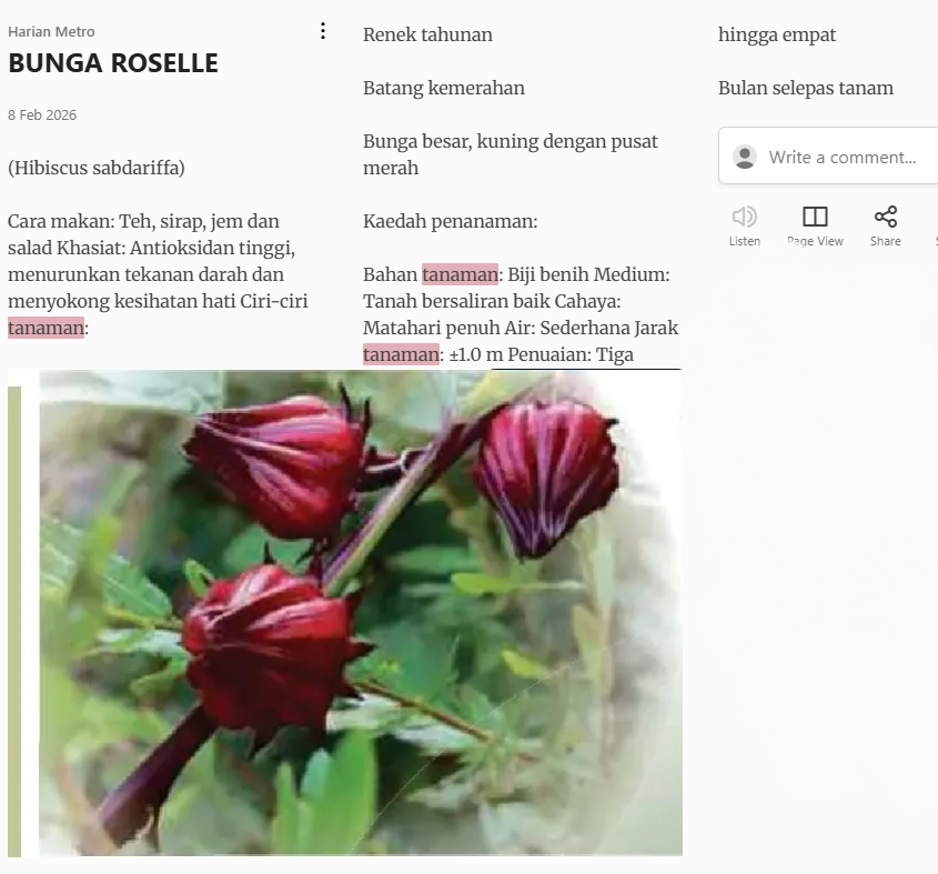 Harian Metro (2026) Bunga roselle. Harian Metro. |