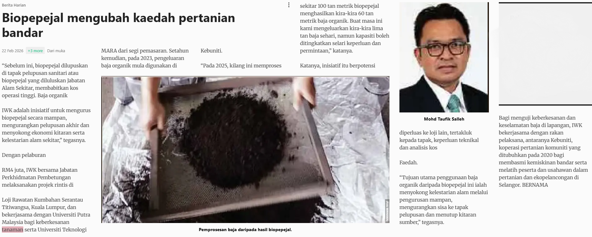 Bernama (2026) Biopepejal mengubah kaedah pertanian bandar. Berita Harian. |
