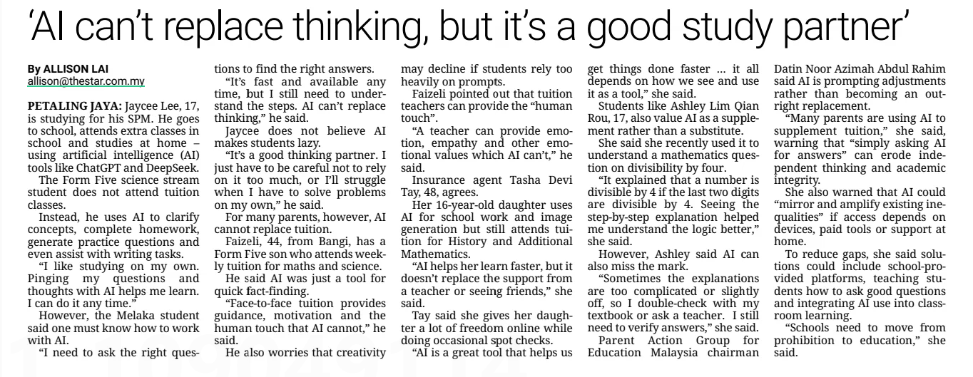 Lai, Allison (2026) AI cant replace thinking, but its a good study partner. The Star. |
