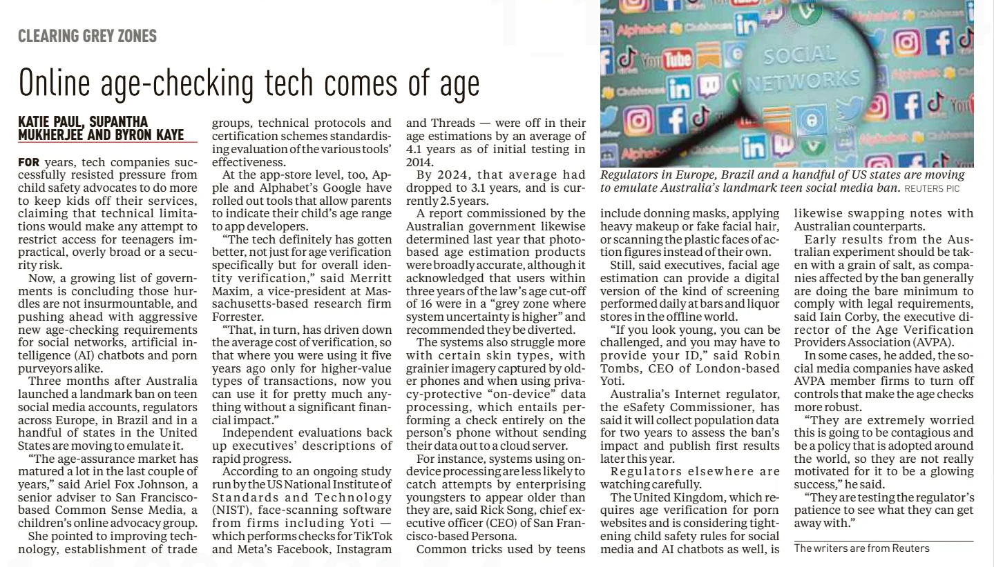 Paul, Katie and Kaye, Byron and Supantha Mukherjee (2026) Online age-checking tech comes of age NST 11326. New Straits Times. |