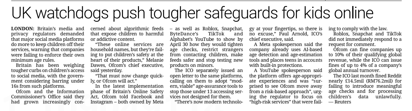 Bernama (2026) UK watchdogs push tougher safeguards for kids online. The Star. |