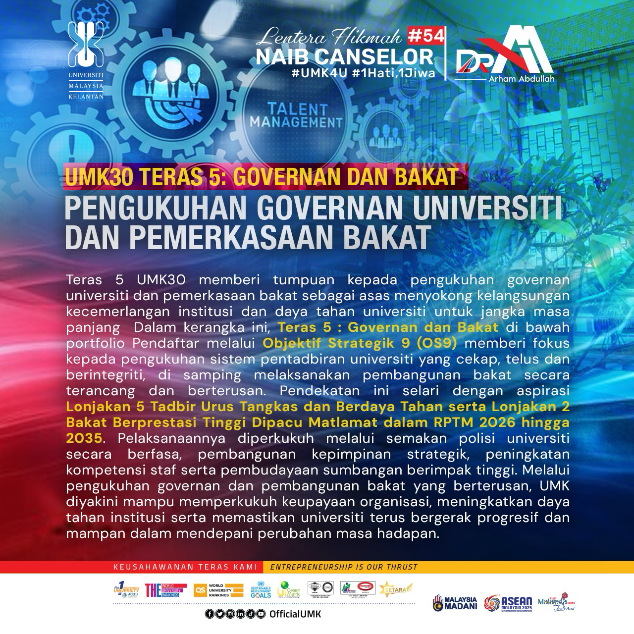 UMK30 TERAS 5: GOVERNAN DAN BAKAT – PENGUKUHAN GOVERNAN UNIVERSITI DAN PEMERKASAAN BAKAT Assalamualaikum Warahmatullahi Wabarakatuh. UMK kini berada pada tahap kematangan sebagai sebuah institusi pendidikan tinggi yang bukan sahaja menumpukan kepada pertumbuhan, malah memperkukuh asas yang menyokong kelangsungan dan daya tahan universiti untuk jangka masa panjang. Sehubungan dengan itu, agenda Pengukuhan Governan Universiti dan Pemerkasaan Bakat diberi penekanan sebagai teras penting dalam memastikan universiti terus bergerak secara progresif dan mampan. Sistem governan yang kukuh serta pembangunan bakat insan merupakan tunjang kepada keupayaan institusi mengurus tadbir secara telus, berkesan dan responsif terhadap perubahan, sekali gus memperkasa potensi warga universiti untuk menyumbang secara signifikan kepada kecemerlangan institusi, masyarakat dan negara Sering saya tegaskan bahawa pengukuhan governan serta pembangunan bakat insan merupakan agenda strategik yang berterusan dalam memastikan kelangsungan kecemerlangan universiti. Dalam kerangka ini, Teras 5 : Governan dan Bakat di bawah portfolio Pendaftar melalui Objektif Strategik 9 (OS9) memberi fokus kepada pengukuhan sistem pentadbiran universiti yang cekap, telus dan berintegriti, di samping melaksanakan pembangunan bakat secara terancang dan berterusan. Pendekatan ini bertujuan memperkasa keupayaan organisasi serta memastikan setiap staf UMK berpeluang untuk berkembang, menyumbang dan memainkan peranan dalam memacu kecemerlangan universiti. Usaha ini selari dengan aspirasi Lonjakan 5 : Tadbir Urus Tangkas dan Berdaya Tahan dalam RPTM yang menekankan kepentingan sistem tadbir urus yang responsif, fleksibel dan berakauntabiliti tinggi dalam menghadapi persekitaran global yang semakin kompleks. Dalam konteks ini, usaha pengukuhan governan di universiti perlu digerakkan melalui pendekatan yang "progressive-based", "decisive action" dan berfokus dalam pelaksanaannya. Pendekatan ini memerlukan komitmen yang berterusan untuk memperkemas dasar dan polisi institusi, memperkukuh pengurusan dokumen melalui pembangunan repositori digital berpusat, serta memperluas program kesedaran dan pemerkasaan governan dalam kalangan seluruh warga staf. Bagi saya, pengukuhan governan bukan hanya mampu memperbaiki sistem sedia ada, malah dapat memastikan universiti sentiasa bersedia untuk bergerak lebih proaktif, responsif dan berdaya tahan dalam berdepan dengan perubahan persekitaran global. Bagi menyokong aspirasi tersebut, KPI 15 menetapkan sasaran peratusan semakan polisi sedia ada yang dikemas kini bagi memperkukuh governan universiti, bermula dengan 20% pada tahun 2026 dan meningkat secara progresif sehingga mencapai 100% menjelang tahun 2030. Pendekatan berfasa ini dirangka bagi memastikan setiap dasar universiti disemak secara teliti dengan mengambil kira perkembangan semasa, keperluan perundangan serta pandangan pihak berkepentingan agar polisi yang dikemas kini kekal relevan dan berfungsi secara berkesan dalam menyokong tadbir urus universiti. Pada masa yang sama, Objektif Strategik 10 (OS10) memberi penekanan kepada usaha memperkasa staf akademik dan pentadbiran ke arah kecemerlangan selaras dengan aspirasi Lonjakan 2: Bakat Berprestasi Tinggi Dipacu Matlamat dalam Rancangan Pendidikan Tinggi Malaysia 2026–2035. Lonjakan ini menumpukan kepada pembangunan komuniti akademik berprestasi tinggi yang digerakkan oleh tujuan dan impak yang jelas melalui pelbagai inisiatif, termasuk pelan penggantian kepimpinan, pembangunan kompetensi secara sistematik, penugasan strategik serta peluasan jaringan profesional di peringkat industri dan antarabangsa. Di bawah OS10, KPI 16 menilai peratusan pengisian jawatan utama daripada barisan kepimpinan yang berwibawa dan berprestasi tinggi dengan sasaran meningkat daripada 70% pada tahun 2026 kepada 90% menjelang tahun 2030. Sasaran ini memberi penekanan kepada usaha membangunkan barisan kepimpinan institusi yang berintegriti, kompeten dan berkeupayaan menerajui pembangunan universiti secara berkesan. KPI 17 pula memberi tumpuan kepada peratusan staf yang mencapai tahap kompetensi cemerlang dan berimpak tinggi dengan sasaran meningkat daripada 80% pada tahun 2026 kepada 90% bermula tahun 2028 dan berterusan sehingga 2030. Inisiatif ini menekankan pembangunan kompetensi warga universiti secara berterusan agar setiap staf mampu melaksanakan peranan dan tanggungjawab dengan lebih berkesan. Pada masa yang sama, KPI 18 mengukur peratusan staf yang menunjukkan sumbangan berimpak tinggi kepada universiti dengan sasaran meningkat daripada 80% pada tahun 2026 kepada 90% menjelang tahun 2028 hingga 2030. Penetapan sasaran ini bertujuan membudayakan prestasi tinggi dalam kalangan warga staf, di mana setiap individu digalakkan untuk menyumbang secara signifikan melalui kepakaran, inovasi dan peranan masing-masing dalam memperkukuh kecemerlangan universiti. Secara keseluruhannya, saya optimis bahawa pengukuhan governan dan pembangunan bakat merupakan dua komponen penting dalam kerangka UMK30 yang saling melengkapi bagi memastikan universiti terus bergerak secara kukuh dan berdaya saing. Besar harapan saya agar sistem governan UMK terus diperkasa dan bakat insan dibangunkan secara berterusan supaya universiti ini mampu menyesuaikan diri dengan perubahan serta menyumbang secara bermakna kepada masyarakat dan negara. Hakikatnya, kecemerlangan sesebuah institusi bertunjangkan sistem yang kukuh serta insan yang sentiasa berkembang seiring dengan perjalanan UMK. Sekian, terima kasih. Ikhlas, |