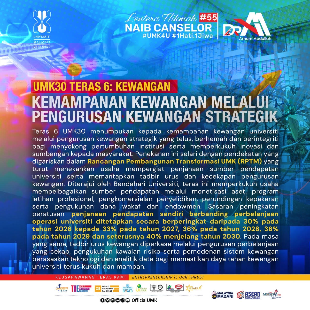 UMK30 Teras 6 : Kewangan – Kemampanan kewangan melalui pengurusan kewangan strategik Assalamualaikum Warahmatullahi Wabarakatuh. Salam UMK4U, 1 Hati 1 Jiwa. Universiti Malaysia Kelantan (UMK) merupakan universiti paling muda dalam kalangan 20 universiti awam di Malaysia yang bermula daripada tiga buah deretan rumah kedai kosong tanpa prasarana lengkap sebagai sebuah universiti awam. Namun dalam tempoh dua dekad ini, walaupun berdepan kekangan sumber, UMK terus berkembang melalui tekad, kesungguhan dan pendekatan yang lebih strategik, cekap serta berfokus dalam memanfaatkan setiap peluang bagi memperkukuh kedudukan institusi setanding universiti awam yang lebih senior. Seiring dengan aspirasi tersebut, menerusi Pelan UMK30 telah memberi penekanan kepada Teras 6 iaitu Kewangan yang memfokuskan kepada kemampanan kewangan melalui pengurusan kewangan strategik, berasaskan tadbir urus sumber yang telus, berhemah dan berintegriti bagi menyokong pertumbuhan institusi, memperkukuh inovasi serta menyumbang nilai signifikan kepada masyarakat. Pelaksanaan teras ini diterajui oleh Bendahari Universiti dengan sokongan semua pusat tanggungjawab bagi memastikan setiap keputusan kewangan dilaksanakan secara cekap, telus dan selari dengan hala tuju strategik universiti. Penekanan terhadap kelestarian kewangan dalam UMK30 juga selari dengan pendekatan yang telah digariskan dalam Rancangan Pembangunan Transformasi UMK (RPTM). Dalam RPTM, aspek ini turut diberi perhatian melalui usaha mempergiatkan penjanaan sumber pendapatan universiti serta memantapkan tadbir urus dan kecekapan pengurusan kewangan. Keselarasan ini memastikan agenda pembangunan universiti bergerak dalam satu hala tuju yang jelas dan tersusun. Melalui OS11 yang Mempergiatkan Penjanaan Sumber Pendapatan Universiti Secara Mampan Melalui Pelbagai Inisiatif, universiti memberi tumpuan kepada usaha memperkukuh keupayaan universiti menjana pendapatan sendiri. Penekanan ini mengambil kira realiti bahawa sumber kewangan universiti tidak lagi boleh bergantung sepenuhnya kepada peruntukan kerajaan semata-mata. Dalam landskap pendidikan tinggi masa kini yang semakin kompetitif, universiti perlu memperkukuh keupayaan menjana sumber pendapatan sendiri. Saya yakin, sudah tentu UMK tidak mahu ketinggalan dan sentiasa komited memperkukuh usaha mempelbagaikan sumber pendapatan bagi memastikan kelangsungan pertumbuhan institusi serta keupayaan universiti untuk terus memberi nilai kepada masyarakat dan negara. Bagi UMK, keperluan ini menjadi lebih signifikan memandangkan universiti masih berada dalam fasa pembangunan dan perlu terus memperkukuh prasarana, program akademik serta keupayaan penyelidikan. Oleh itu, sasaran peningkatan peratusan penjanaan pendapatan sendiri berbanding perbelanjaan operasi universiti ditetapkan secara berperingkat daripada 30% pada tahun 2026, meningkat kepada 33% pada tahun 2027, 36% pada tahun 2028, 38% pada tahun 2029, dan seterusnya 40% menjelang tahun 2030. Pendekatan berperingkat ini memberi ruang kepada universiti untuk membina ekosistem penjanaan pendapatan yang lebih kukuh dan mampan. Usaha ini turut melibatkan pengoptimuman pelbagai potensi yang dimiliki universiti, termasuk melalui monetisasi aset universiti, pengembangan program latihan profesional, pengkomersialan hasil penyelidikan, aktiviti perundingan kepakaran akademik serta penglibatan syarikat milik universiti dan koperasi. Di samping itu, pengukuhan dana wakaf, endowmen serta sumbangan strategik turut menjadi antara pendekatan penting dalam menyokong kelestarian kewangan universiti dalam jangka panjang. Pada masa yang sama, universiti turut memberi perhatian kepada OS12 iaitu Memantapkan Tadbir Urus dan Kecekapan Pengurusan Kewangan Universiti yang memberi penekanan supaya sumber kewangan diurus secara cekap, telus dan bertanggungjawab. Bagi saya, keupayaan kewangan sesebuah universiti diukur melalui keseimbangan antara keupayaan menjana pendapatan dengan pengurusan perbelanjaan yang berdisiplin, cekap dan berintegriti. Tadbir urus kewangan yang cekap dan berintegriti juga akan meningkatkan keyakinan pihak luar untuk bekerjasama dengan universiti. Apabila sistem pengurusan kewangan dilaksanakan secara telus dan profesional, ia akan memberi kepercayaan kepada pelabur, pembekal serta penyedia perkhidmatan untuk menjalin kerjasama dengan UMK. Keyakinan ini membuka lebih banyak peluang kerjasama strategik dan pada masa yang sama memperkukuh reputasi universiti sebagai institusi yang diyakini serta berdaya tadbir. Sehubungan dengan itu, Universiti menyasarkan peningkatan kecekapan perbelanjaan tahunan secara berperingkat, iaitu daripada 3% pada tahun 2026 dan 2027 kepada 4% pada tahun 2028 dan 2029, seterusnya mencapai 5% menjelang tahun 2030. Sasaran ini bertujuan memastikan setiap sumber kewangan universiti dimanfaatkan secara optimum melalui pengukuhan kawalan perbelanjaan, pemantapan pengurusan risiko kewangan serta pelaksanaan pemantauan yang lebih sistematik terhadap perbelanjaan operasi. Pada masa yang sama, pemodenan sistem pengurusan kewangan melalui penggunaan teknologi digital dan analitik data turut diberi keutamaan bagi mempercepat proses kerja, meningkatkan ketepatan data kewangan dan menyokong pembuatan keputusan yang lebih strategik dalam pengurusan sumber universiti. Perjalanan UMK sejak penubuhannya membuktikan bahawa sebuah institusi mampu berkembang melalui kebijaksanaan mengurus sumber yang terhad serta komitmen tinggi seluruh warganya. UMK kini semakin diyakini sebagai sebuah universiti yang berdaya saing. Dengan tadbir urus kewangan yang kukuh serta kesepaduan seluruh warga universiti, UMK diyakini akan terus melangkah dengan lebih berdaya tahan, memperkukuh kedudukannya dalam landskap pendidikan tinggi negara dan berdiri sepentas dengan universiti awam lain dalam merealisasikan aspirasi UMK30. Sekian, terima kasih. Ikhlas, |