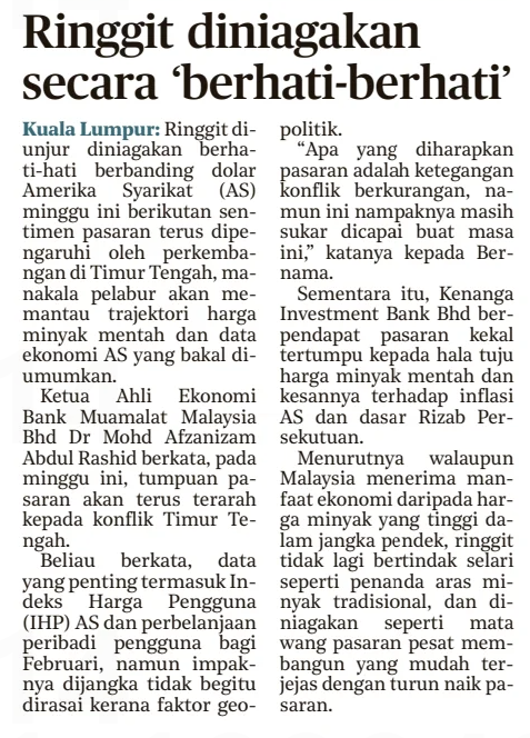 Sri Ayu Kartika Amri (2026) Ringgit diniagakan secara ‘berhati-berhati’. Metro. |