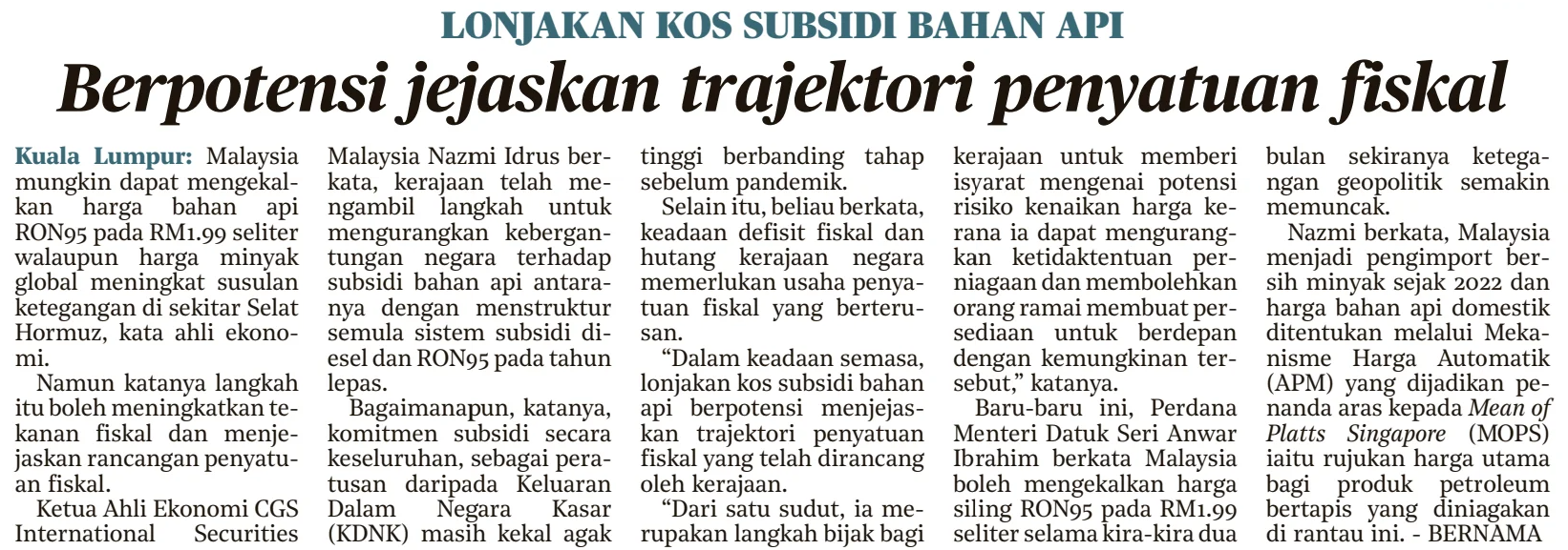 Bernama (2026) Lonjakan Kos Subsidi Bahan Api Berpotensi Jejaskan Trajektori Penyatuan Fiskal. Metro. |