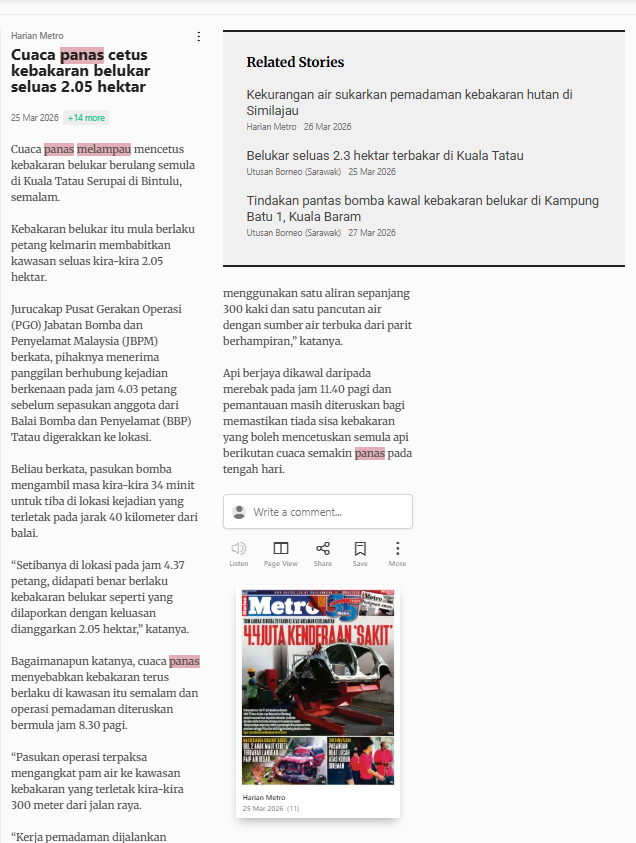 Bernama (2026) Cuaca Panas Cetus Kebakaran Belukar Seluas 2.05 Hektar. Harian Metro. |