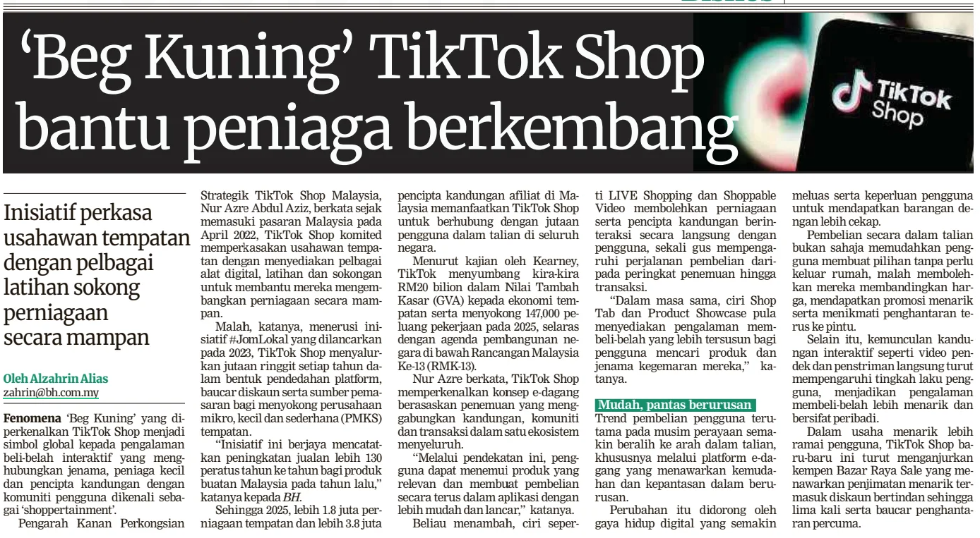 Alzahrin Alias (2026) 'Beg Kuning' Tiktok Shop Bantu Peniaga Berkembang. Berita Harian. |