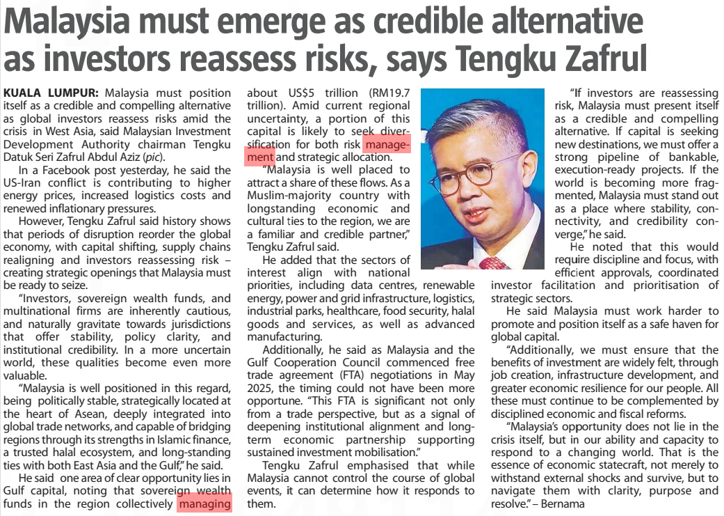 Bernama (2026) Malaysia Must Emerge as Credible Alternative as Investors Reassess Risks, Says Tengku Zafrul. The Sun (Malaysia). |