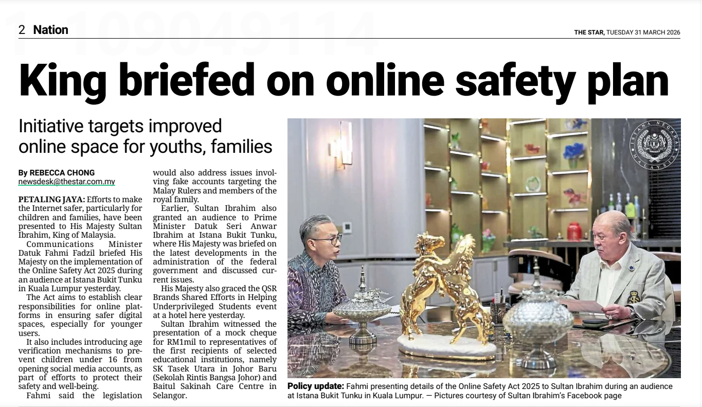 Chong, Rebecca (2026) King briefed on online safety plan. The Star. |