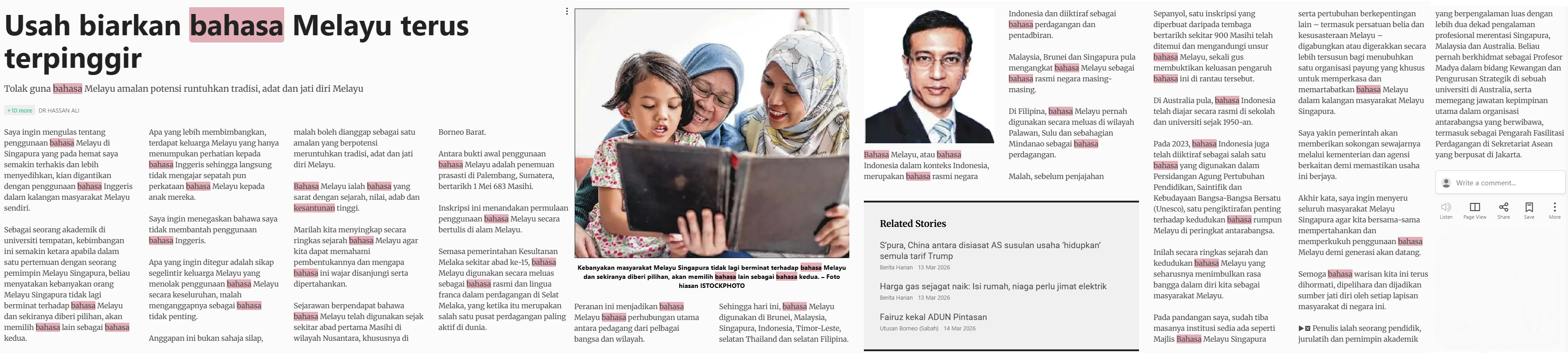 Dr Hassan Ali (2026) Usah biarkan bahasa Melayu terus terpinggir. Berita Harian SG. |