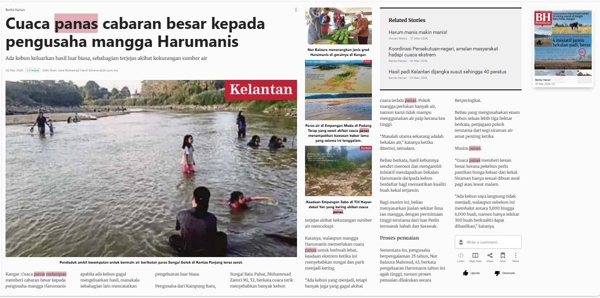 Noor Sara Mohamad Hanif (2026) Cuaca Panas Cabaran Besar Kepada Pengusaha Mangga Harumanis Ada Kebun Keluarkan Hasil Luar Biasa, Sebahagian Terjejas Akibat Kekurangan Sumber Air. Berita Harian. |