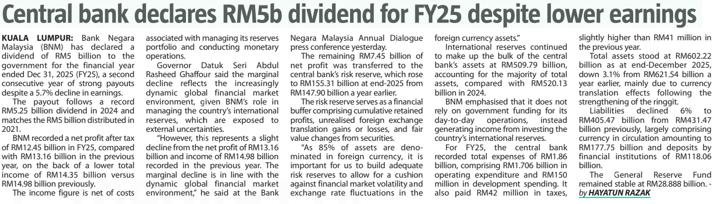Hayatun Razak (2026) Central Bank Declares RM5b Dividend for FY25 Despite Lower Earnings. The Sun (Malaysia). |