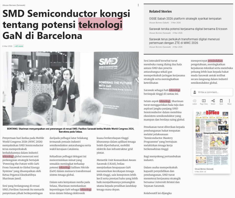 Bernama (2026) SMD Semiconductor kongsi tentang potensi teknologi GaN di Barcelona. Utusan Borneo (Sarawak). |