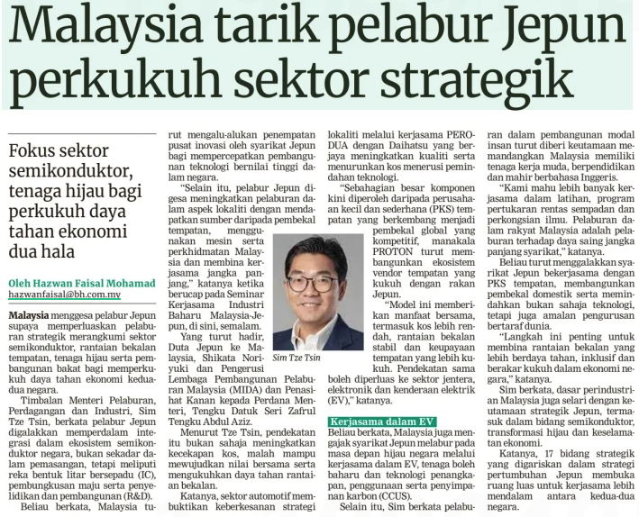 Hazwan Faisal Mohamad (2026) Malaysia Tarik Pelabur Jepun Perkukuh Sektor Strategik. Berita Harian. |