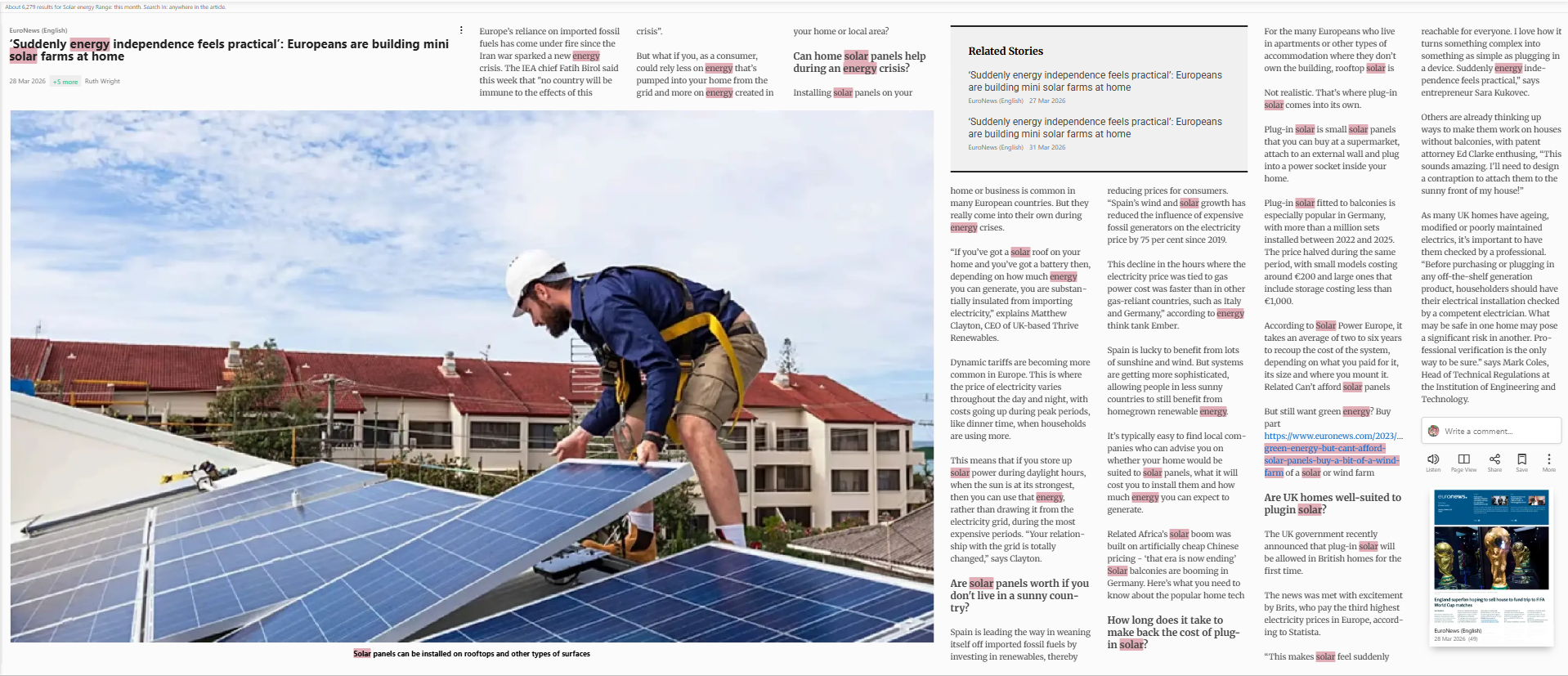 Ruth Wright (2026) ‘Suddenly energy independence feels practical’: Europeans are building mini solar farms at home. EuroNews (English). |